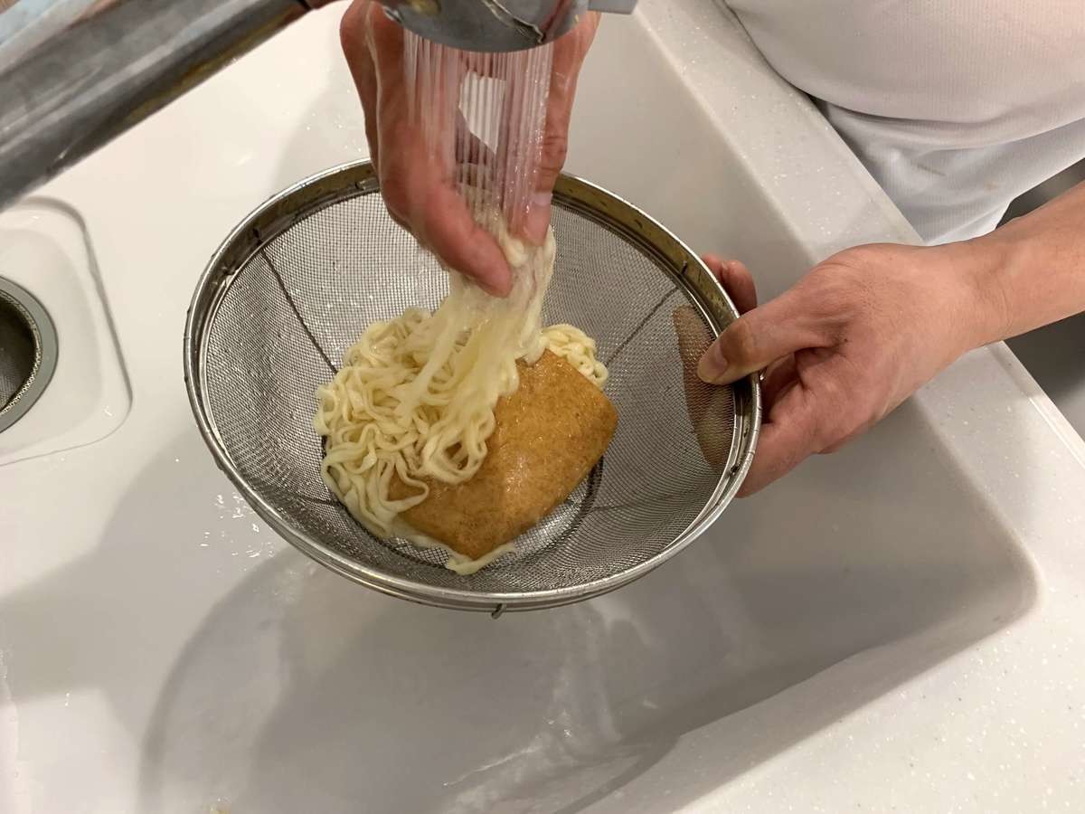 ザルにあけたうどんやお揚げを冷水でよく冷やして、締めます。