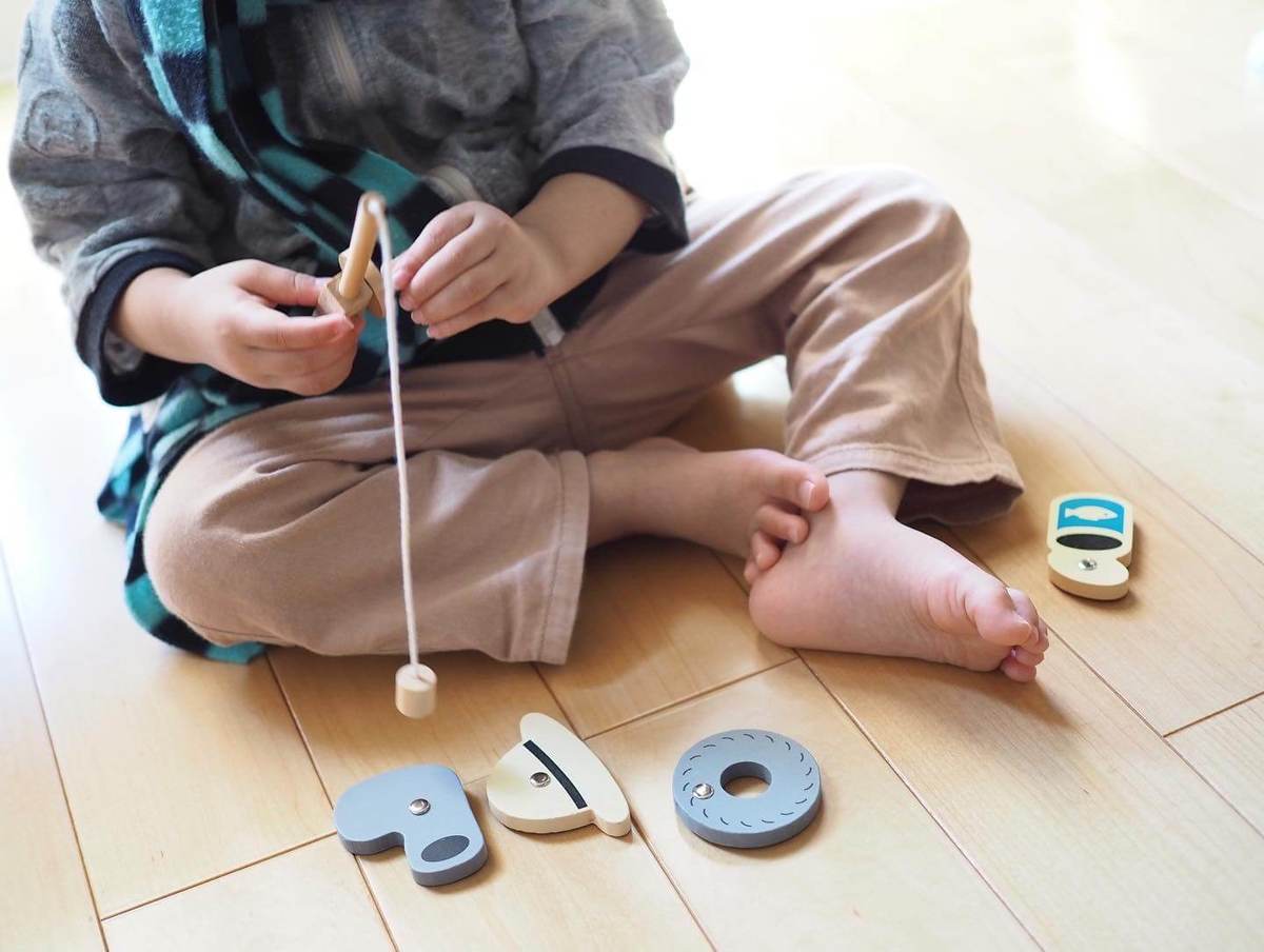 ナチュラルでかわいい木製の、お魚つりができる知育玩具で、竿を使って近づけるとマグネットでお魚がくっついて釣れる仕組みになっています♪