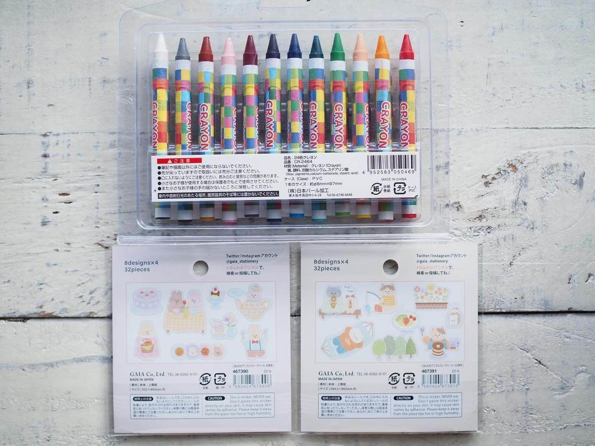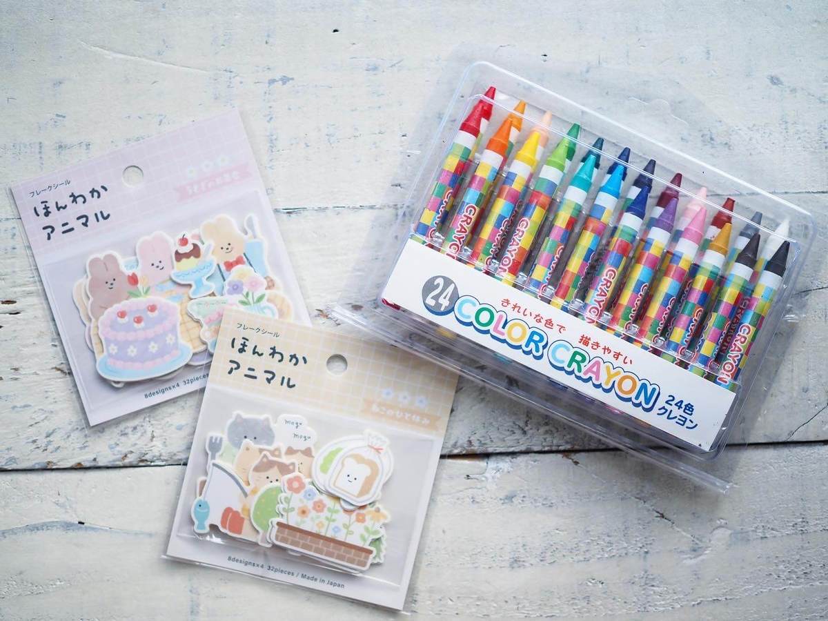 続いてご紹介するのは、かわいいアニマル柄のフレークシールが入った「ほんわかアニマル」と色んな色が楽しめる「24色クレヨン」です。