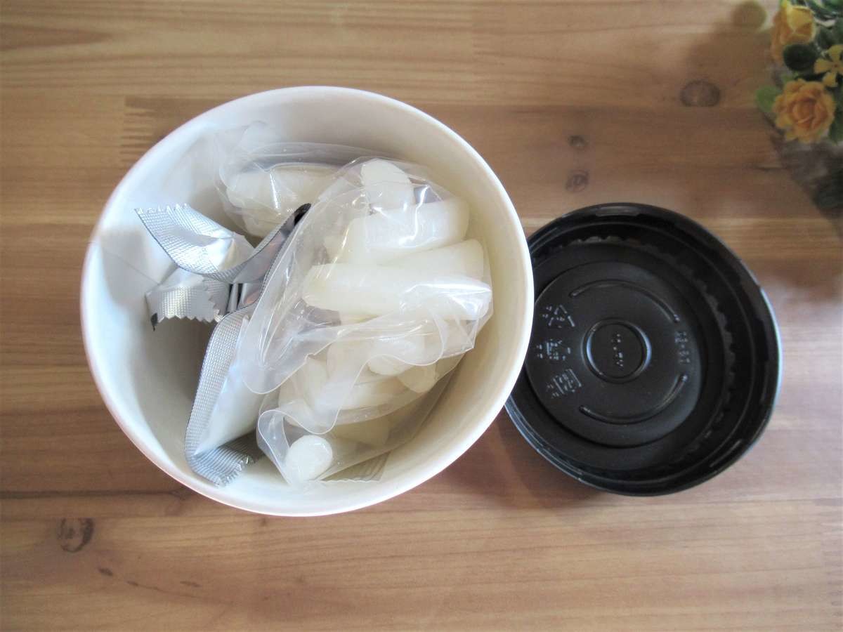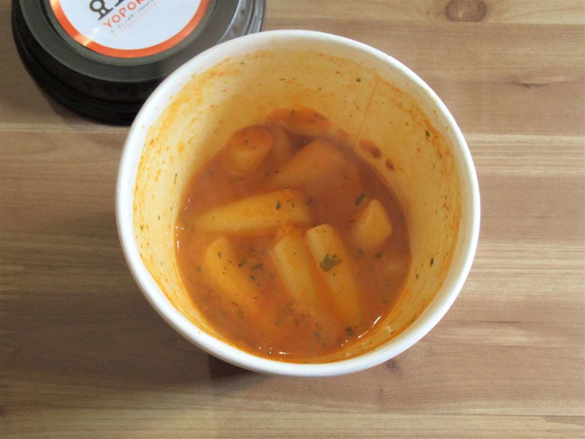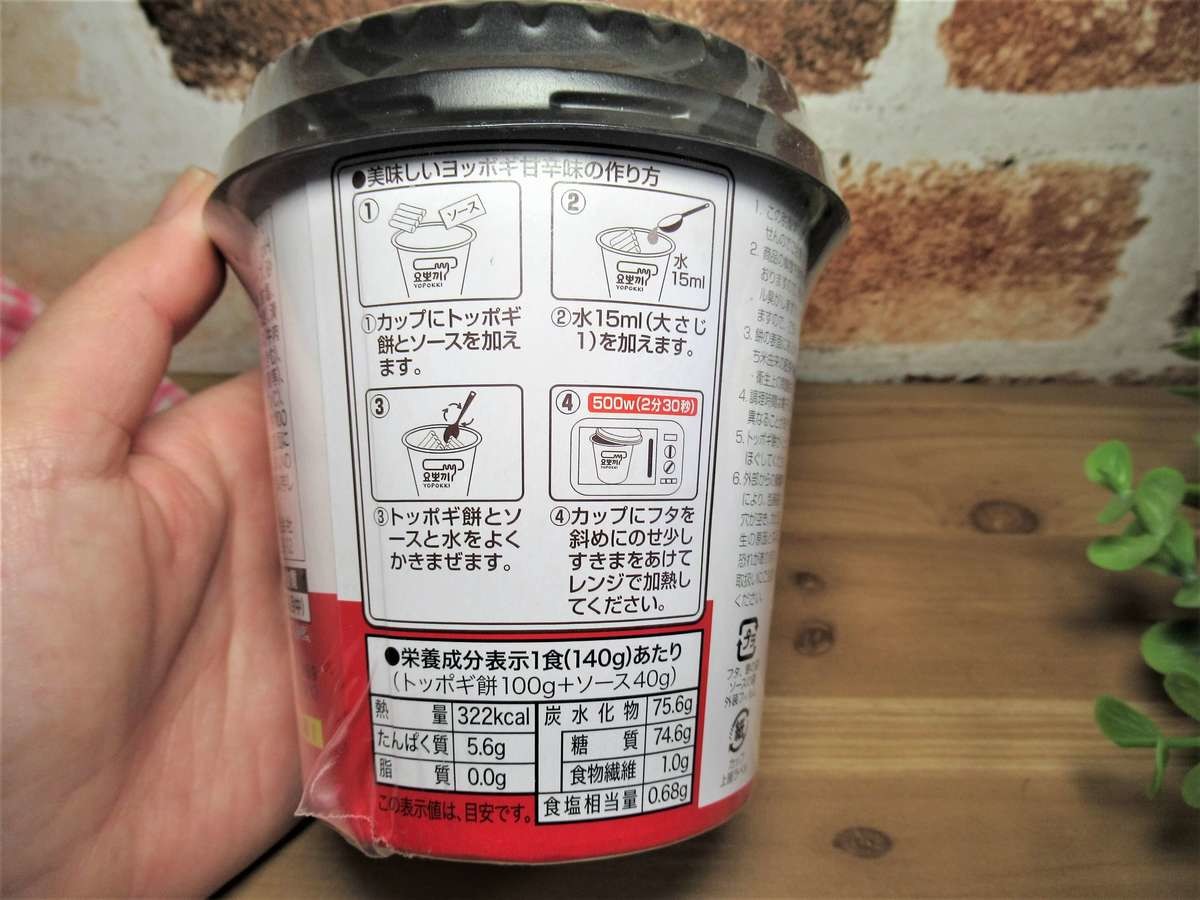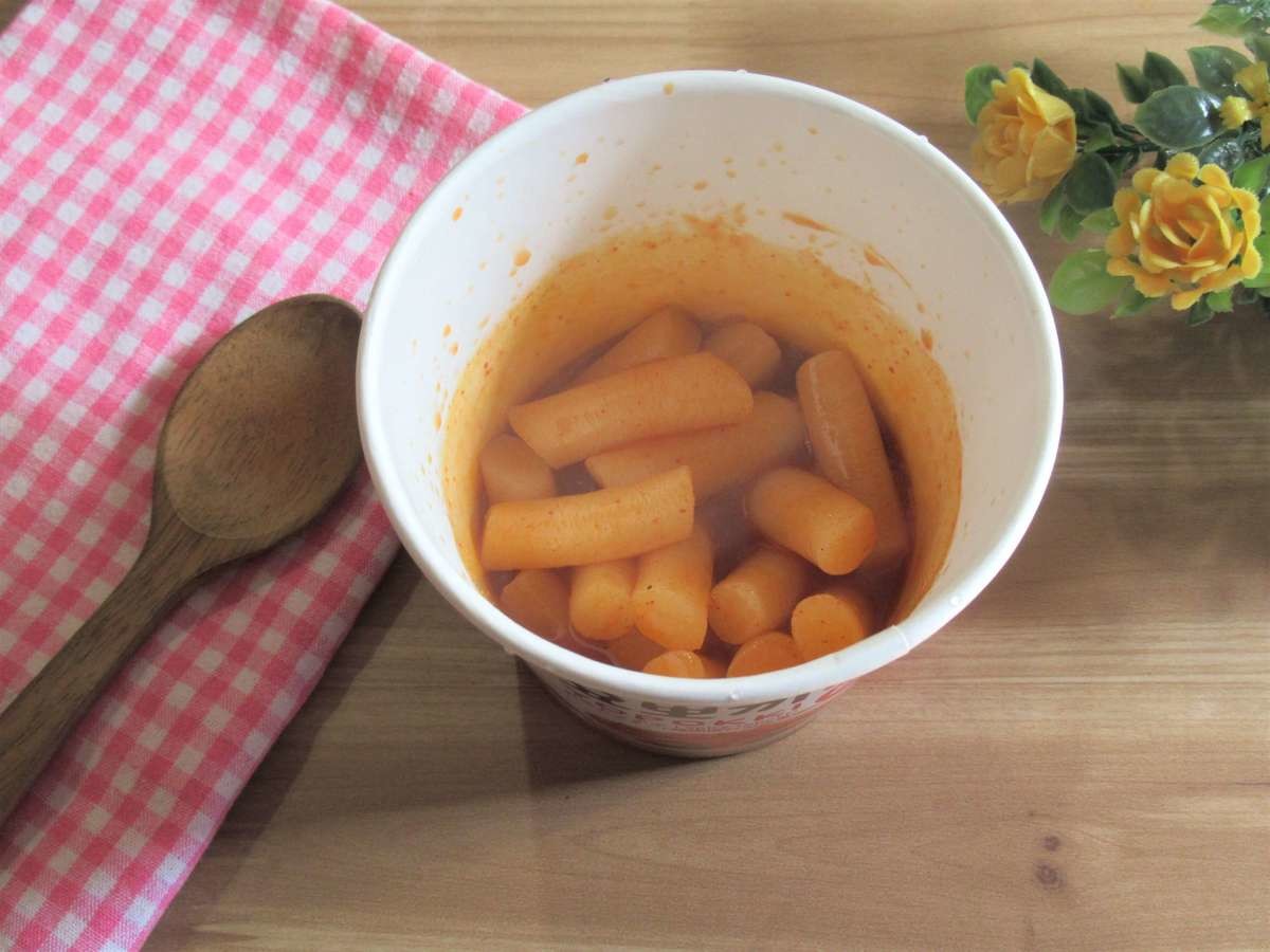 一般的なスーパーや業務スーパーで売っているトッポギは、フライパン調理が必要で煮込み時間も割と長い印象でしたが、こちらはカップのまま電子レンジにかけるだけでOK。