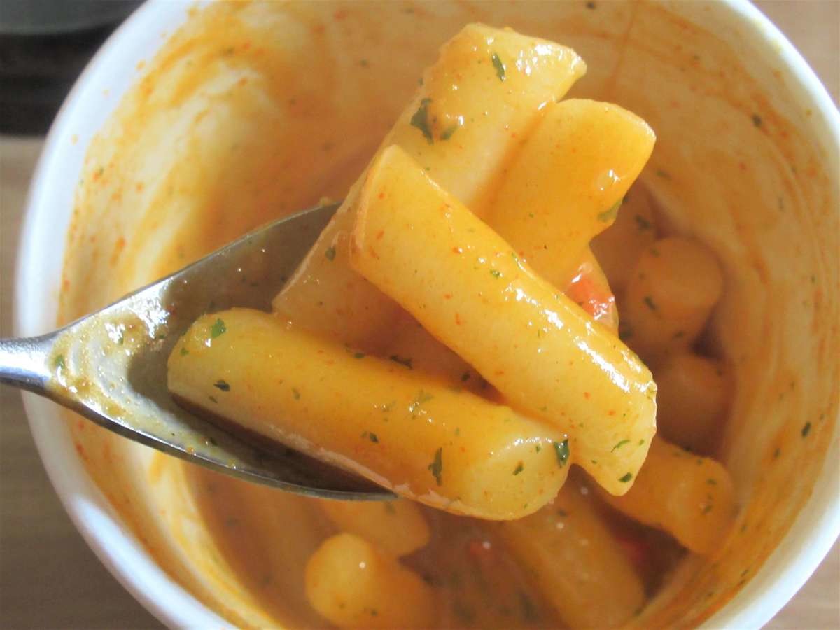 こちらはチーズの香りなのか、独特な匂いがして正直好き嫌いは分かれそうな印象も……。 ただ、実際に食べてみると匂いよりもマイルドな辛さとトッポギ餅のもちもち感のほうが強く感じて普通においしい……。