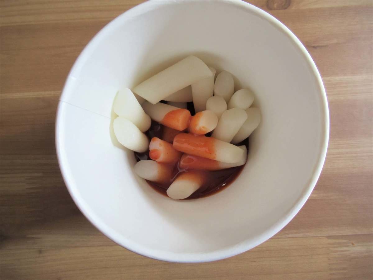開けてみると、中身はトッポギ餅とソースが入ったシンプルなもの。日本でいうカップラーメンみたいなイメージなのかもしれませんね。