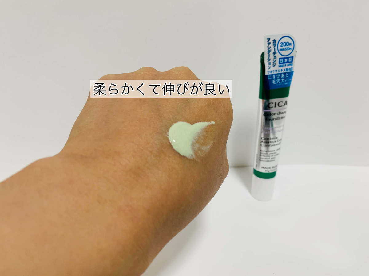 実際に肌に出すと、柔らかく伸びのいいグリーンカラーが自然な肌色に変化していきます。