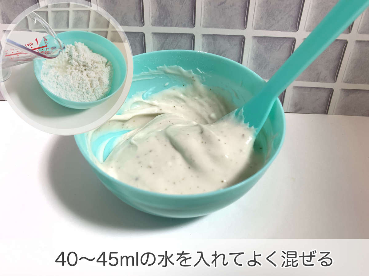 使い方は、カップに粉(22g)を全て入れて40〜45mlのお水を入れ混ぜ合わせます。CICA(シカ)成分配合のパックは緑色のつぶつぶが入っていました。