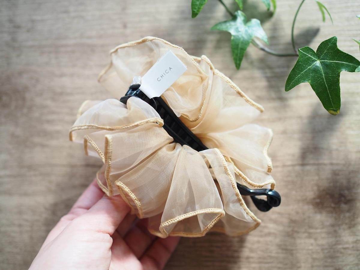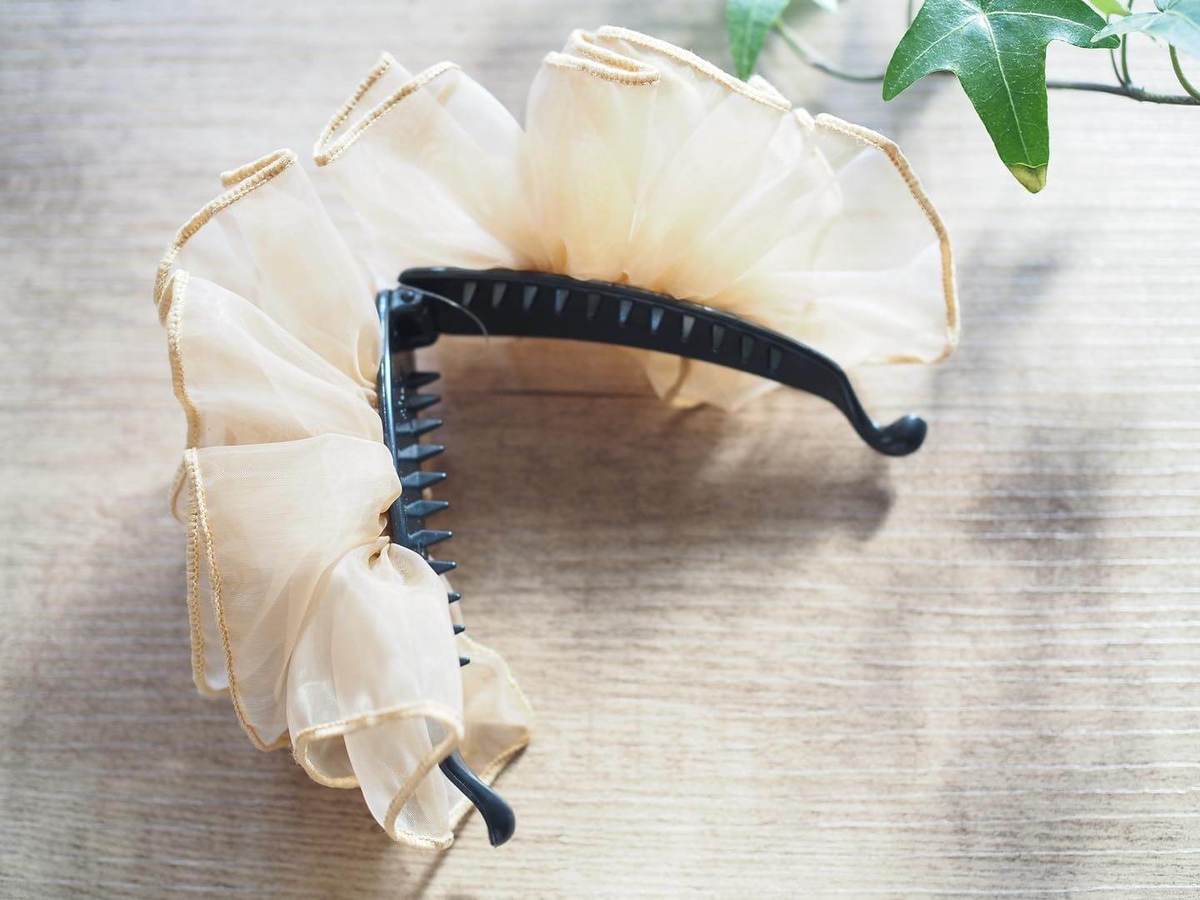 「オーガンジーフリルバナナ」は挟むだけで華やかなヘアスタイルが決まるバナナクリップです。
