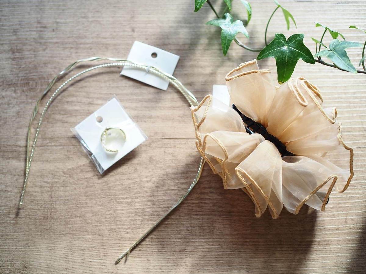 まず最初にご紹介するのはスリコでも人気のアクセサリーから「ねじれ2Pメタルカシューシャ」と「パール切替メタルリング」と「オーガンジーフリルバナナ」です。