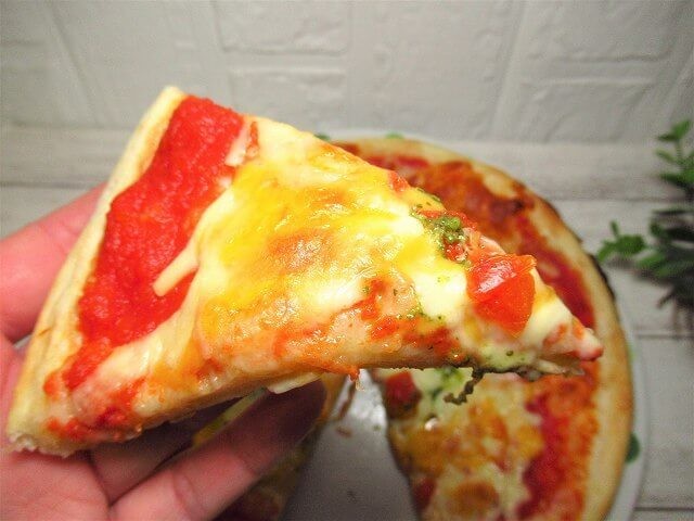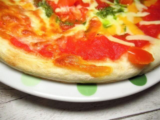 この手の冷凍マルゲリータピザは、トマトソースやバジルソースがお気持ち程度な量なものもありますが、こちらは全体的にソースがたっぷりかかっていて満足感があります。