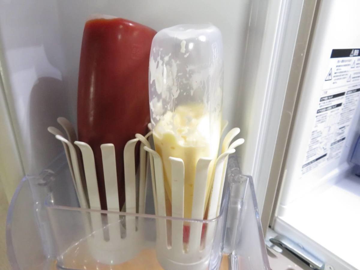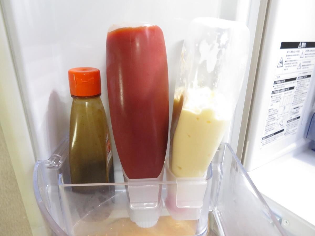 マヨケチャホルダーに変えたら、ボトル1本分の空間が生まれ、収納力がアップ!ソースのボトルを入れても窮屈にならず、余裕で出し入れできます。