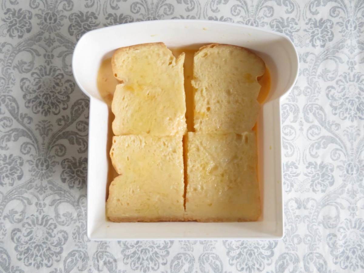 食パンに卵液をかけ、ひたひたになるまでしばらく放置。何度かケースを傾けたら、勝手に食パンが吸っていきます。