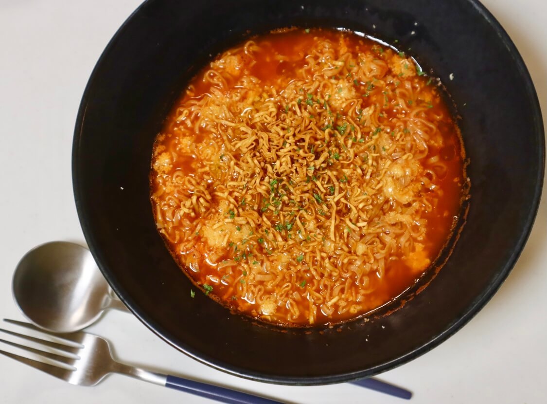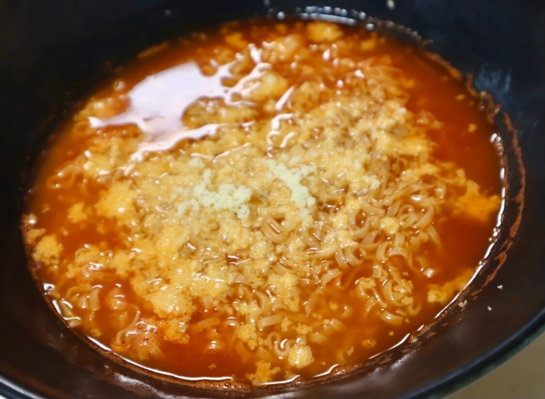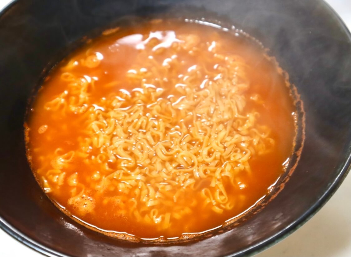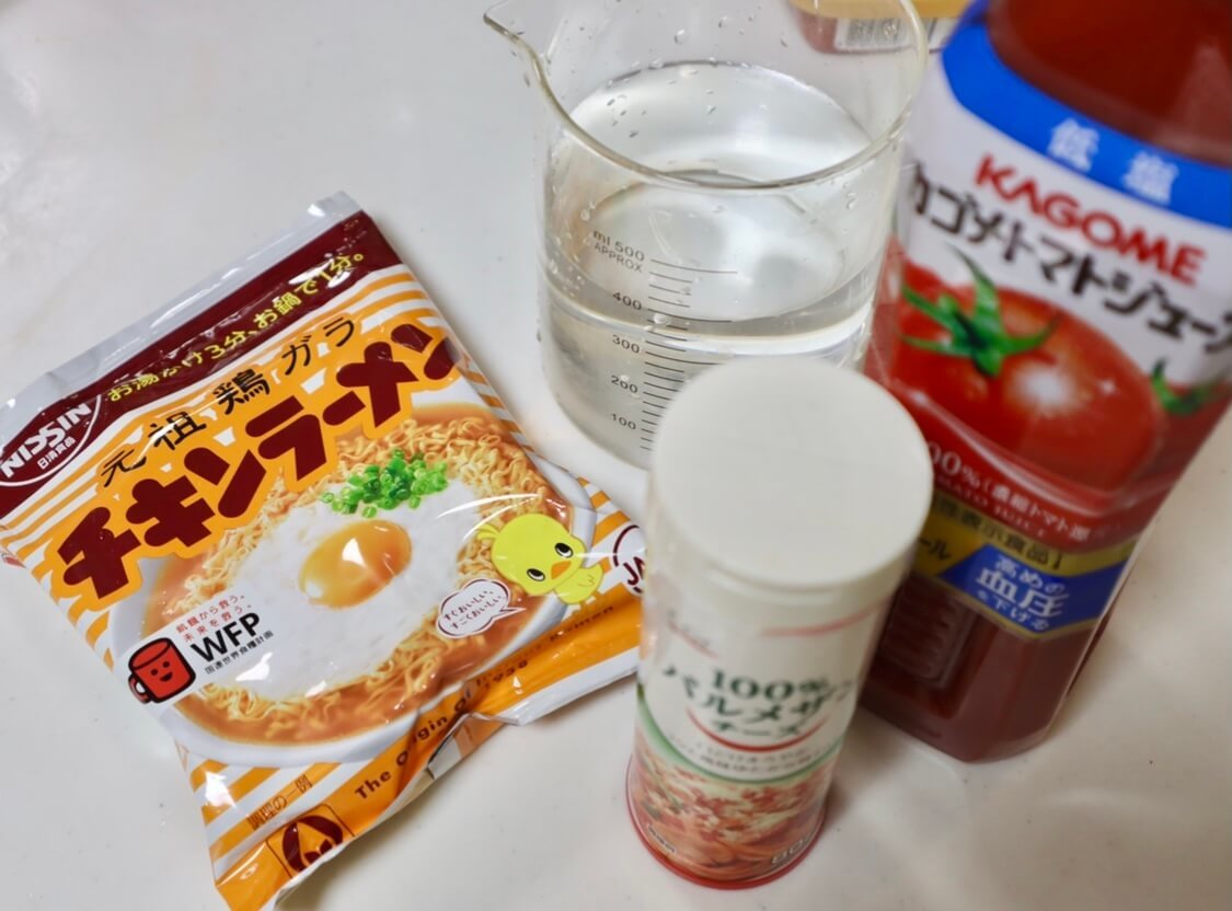 トマトジュースの酸味とチーズが合わさって、いつものチキンラーメンよりも旨味がすごいんです!