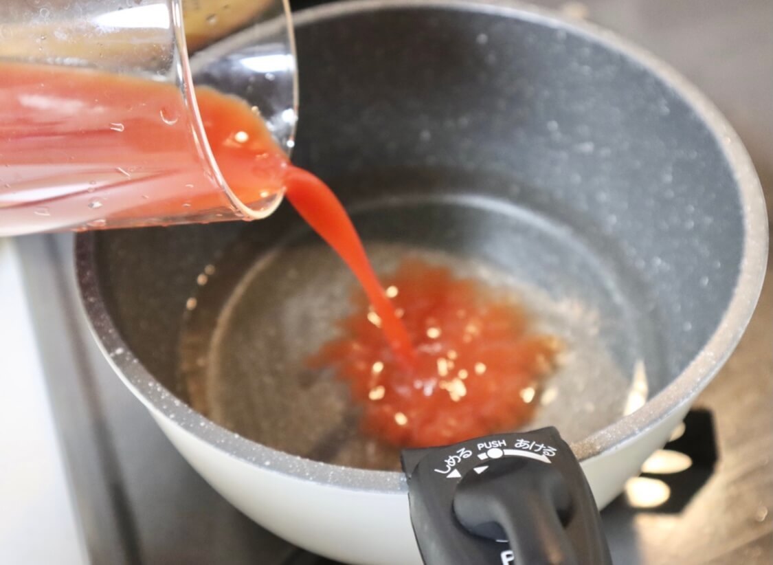 鍋にトマトジュースと水(360cc)を入れて沸騰させます。