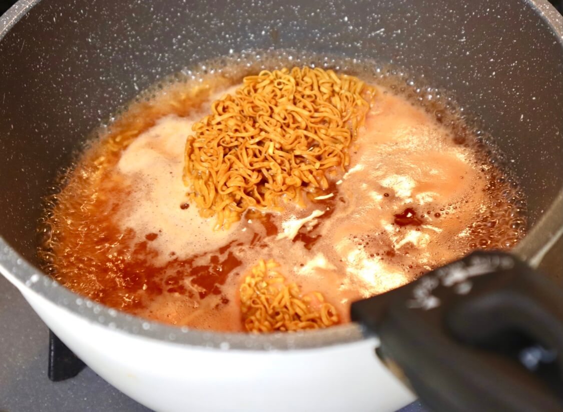 沸騰したら、チキンラーメンを投入!約2分間、箸でほぐしながら鍋で煮込みましょう。