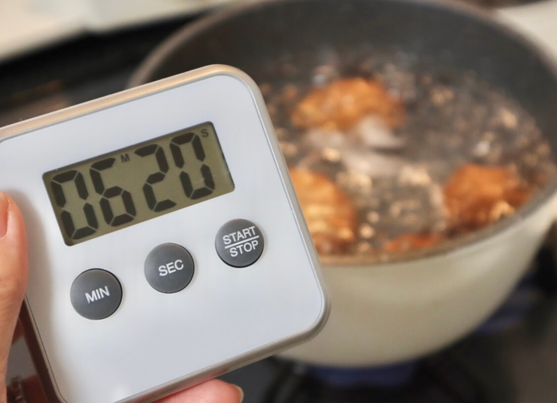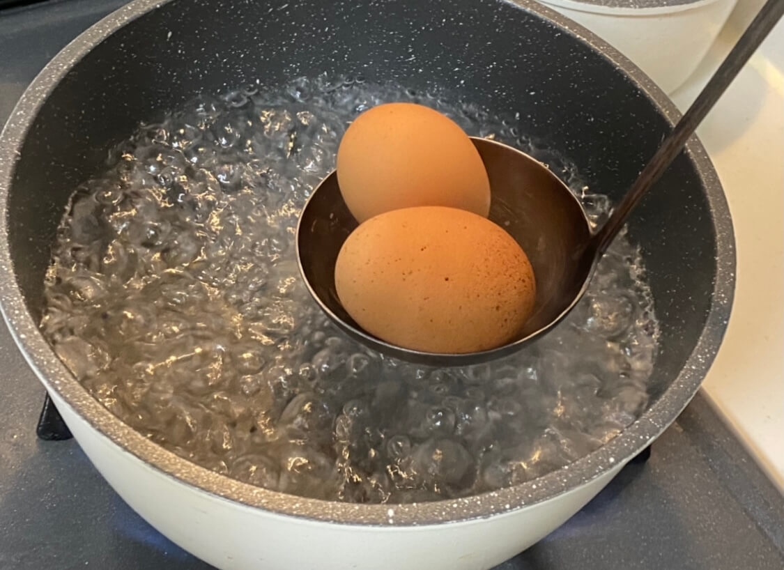 お湯を沸騰させ、卵が割れないようにそっと投入したら、6分20秒茹でていきましょう!