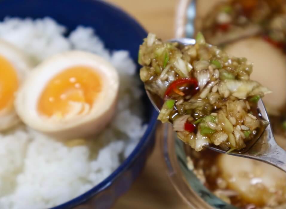 甘じょっぱさとピリ辛具合、そしてネギの香りとシャキシャキ感が半熟卵と相性抜群♡
