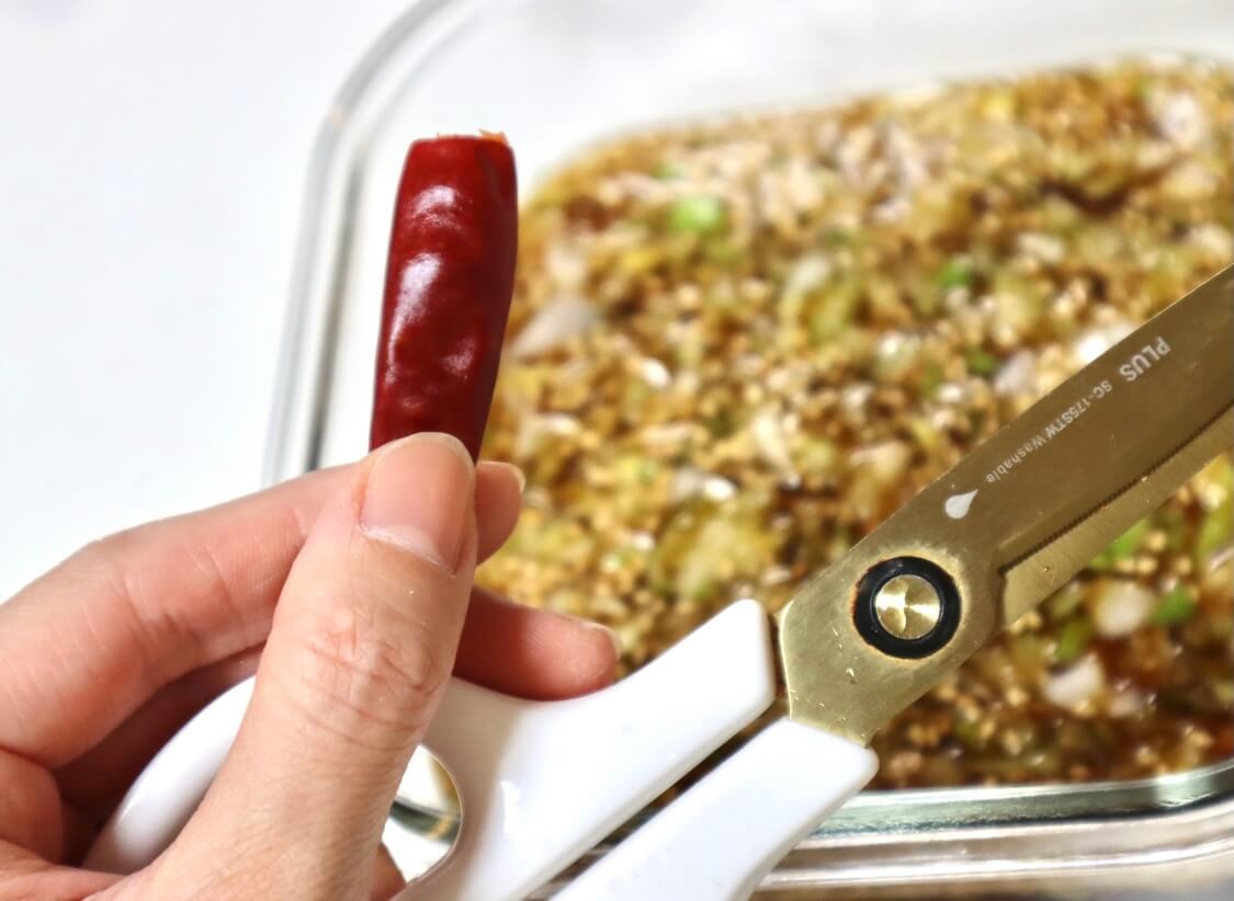 すでに美味しそうな調味液に、鷹の爪をプラス!