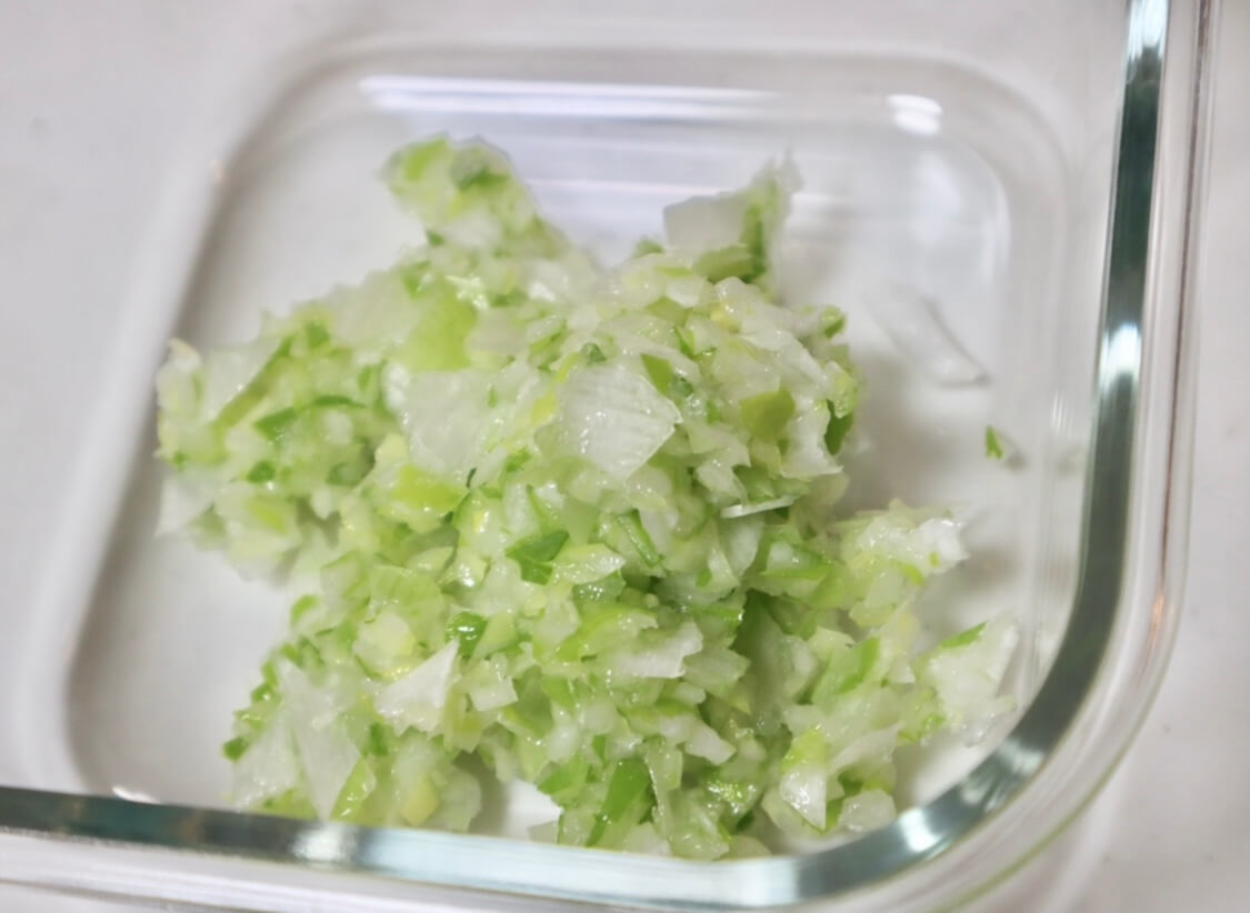 次に、長ねぎと玉ねぎをみじん切りしていきます。ラヴィットの作り方どおりにするときは、ここで玉ねぎ1/4個を使います。