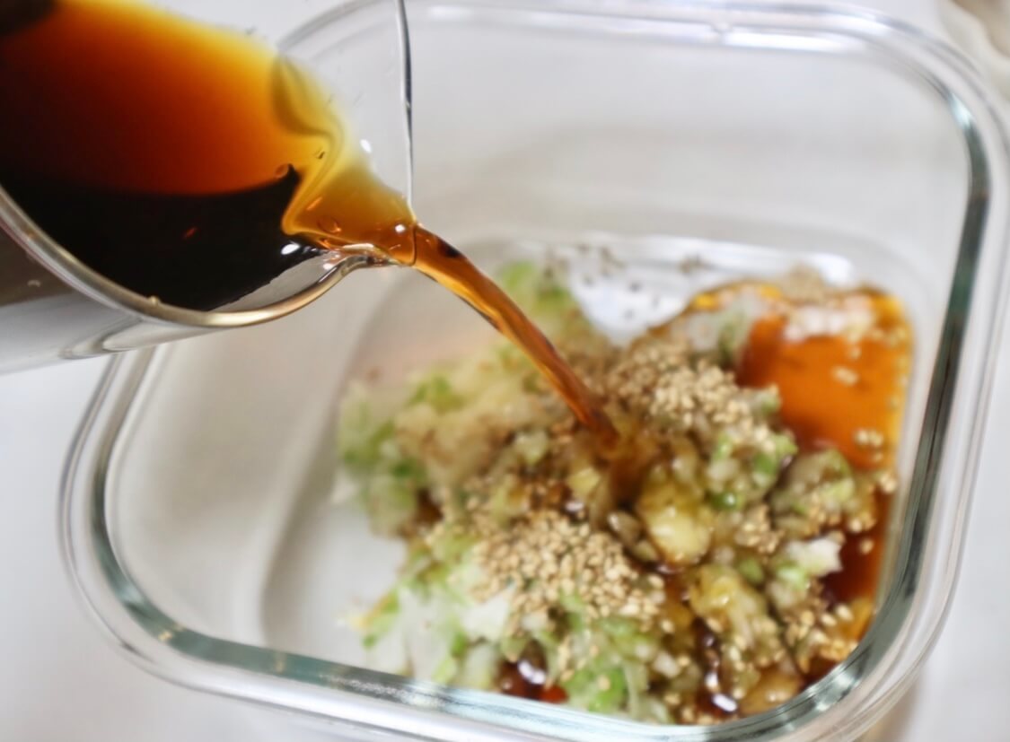 茹で卵が6つ入る大きめの容器に、長ねぎ・玉ねぎ・ごま・にんにくを入れていきます。
