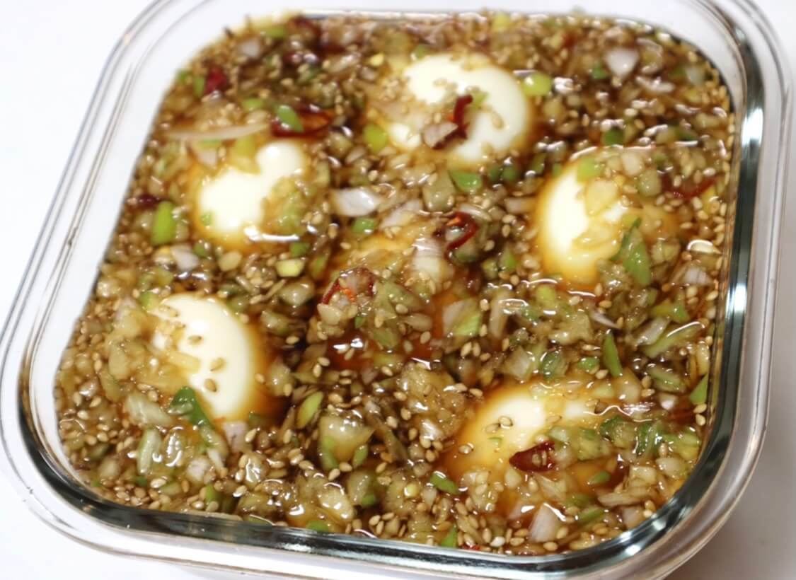 麻薬卵の作り方③鷹の爪を加えて卵を漬ける