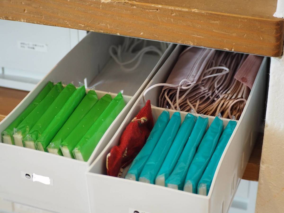 学習用品の収納ではありませんが、毎日持参するティッシュやマスクの収納には、無印良品の引出し式のポリプロピレンケースを愛用しています。
