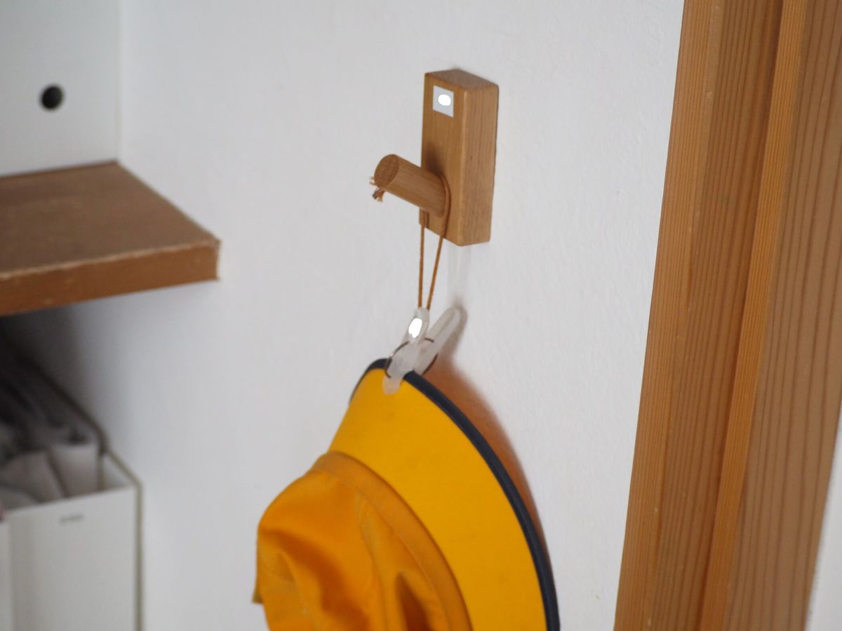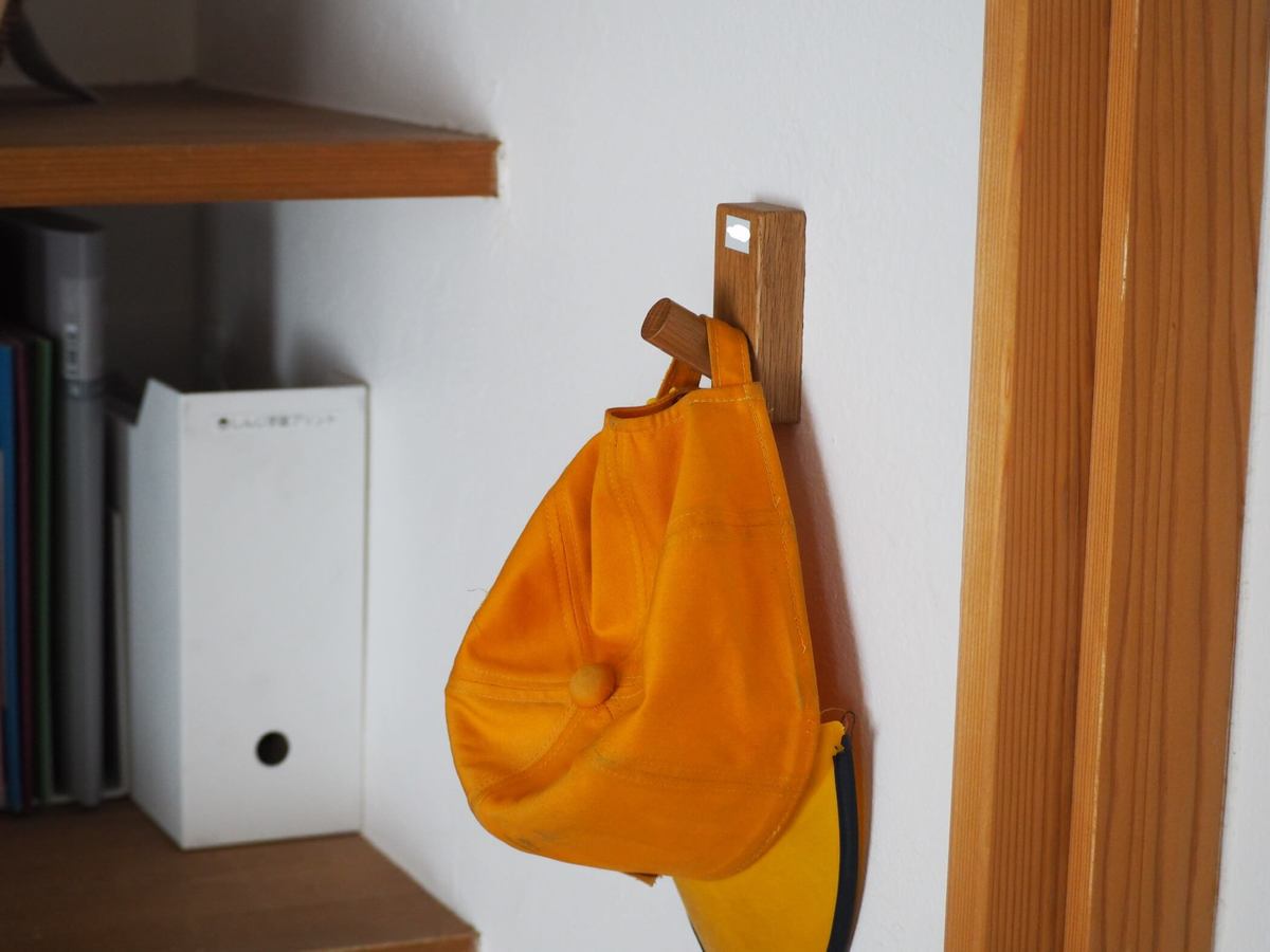 でも通学帽などの収納場所は必要なので、学用品をまとめている棚のすぐ近くに帽子を引っ掛けられる場所を作りました。