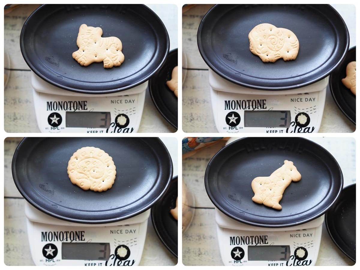 キリンやゾウなどいろんな形がありますが、計ってみたらなんとどれも3gでした。 250g入りなので1袋に約83枚入っていることになりますね。
