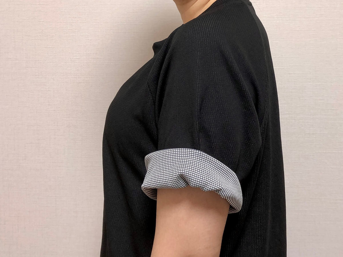 細見えを意識するなら、今回写真はないのですがチャコールグレーもおすすめでした。同じく、脇の下の縦ラインが黒く、クロTシャツよりも陰影がつき細く見えます。