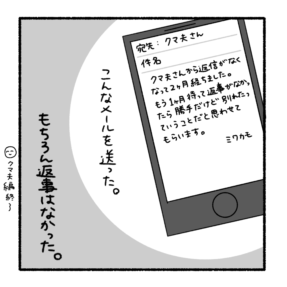 ダン君(夫)の告白を断ったあと、ミワカモさんは大人の男性クマ夫とのお付き合いをスタート。したものの、このような結末に。
