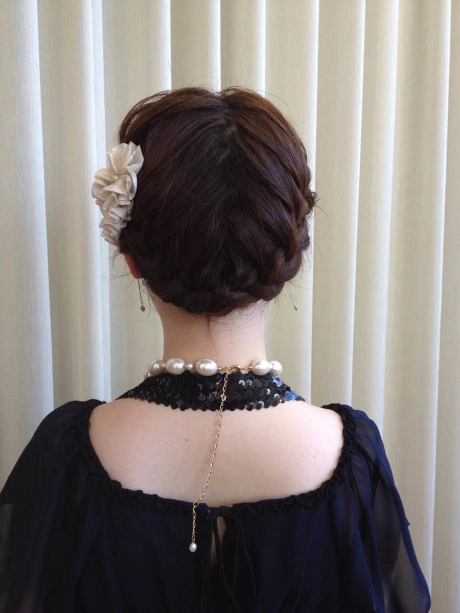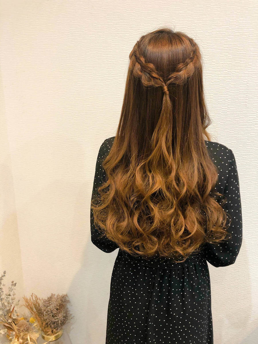 くるりんぱと三つ編みでボリューム感がでるので、カールアイロンで巻かなくても華やかに見えますよ。