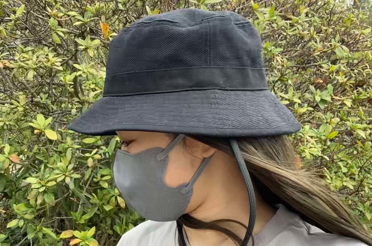 風の強い日はあご紐を絞れば、より固定した状態で被れますよ!