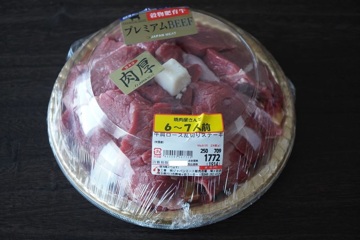 テレビでは「牛肩ロースジャンボステーキ」が紹介されていましたが、我が家のおすすめはこちらの「牛肩ロース乱切りステーキ」です。