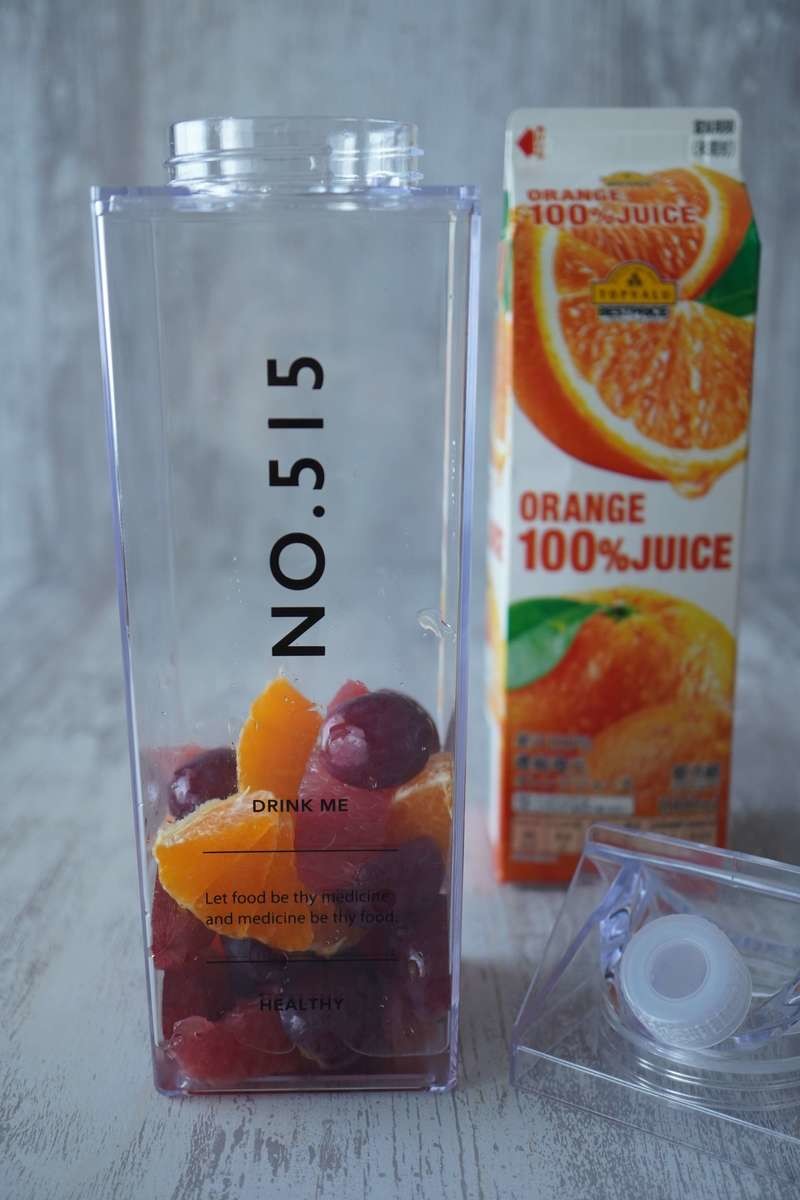 葡萄やグレープフルーツ、リンゴや梨など、一口サイズにカットしたフルーツを容器に入れオレンジジュースに半日ほど漬け込めばいろいろなフルーツの旨味が凝縮されたオレンジジュースが出来上がります。