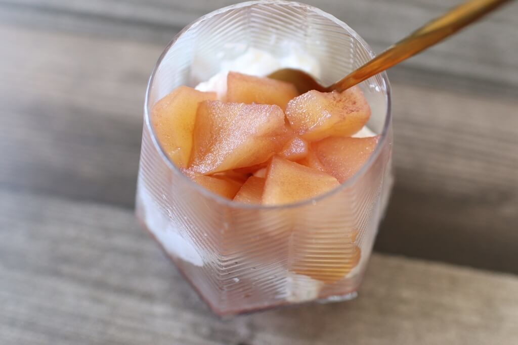 ヨーグルトに煮たりんごを乗せてみました。デザートグラスとして使うのもかわいいですよね♪グラススイーツを作る時に重宝しますよ。