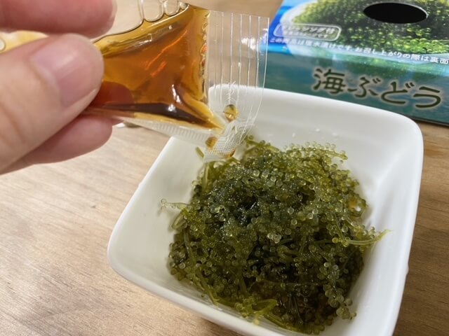 ドレッシングやポン酢などは、別皿に入れて、海ぶどうを付けて食べると◎