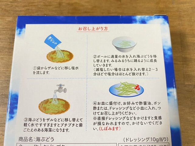 塩水漬けにされた海ぶどうは、水洗いが必要です。食べるまでの手順は裏面に丁寧に記載されています。