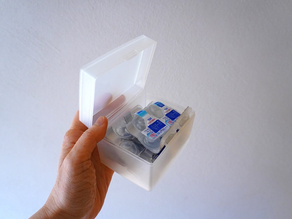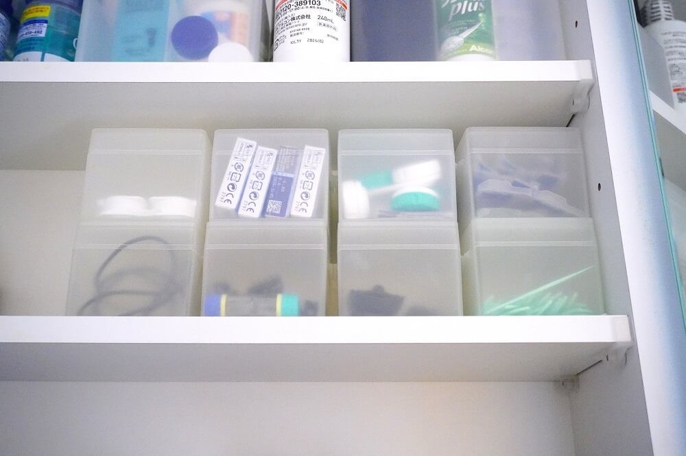 なかにはコンタクトのケースの在庫や使い捨てのコンタクトの在庫、糸ようじなどを収納しています。