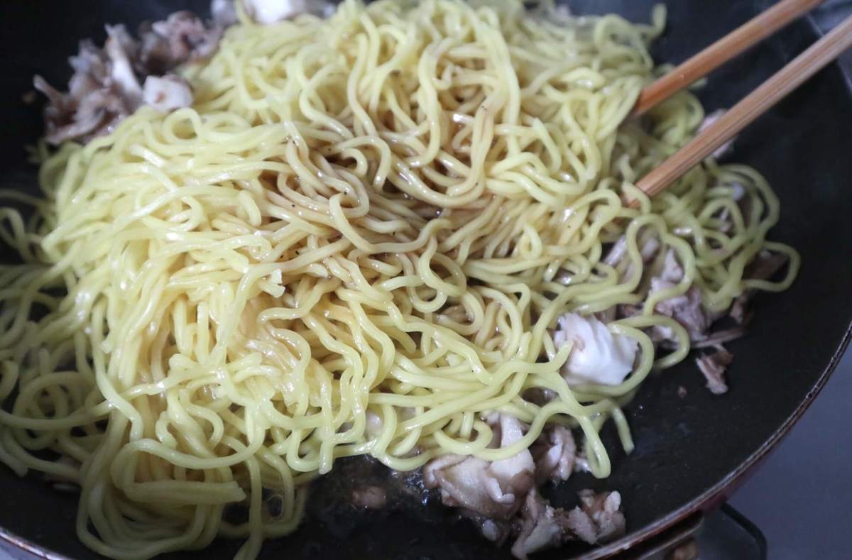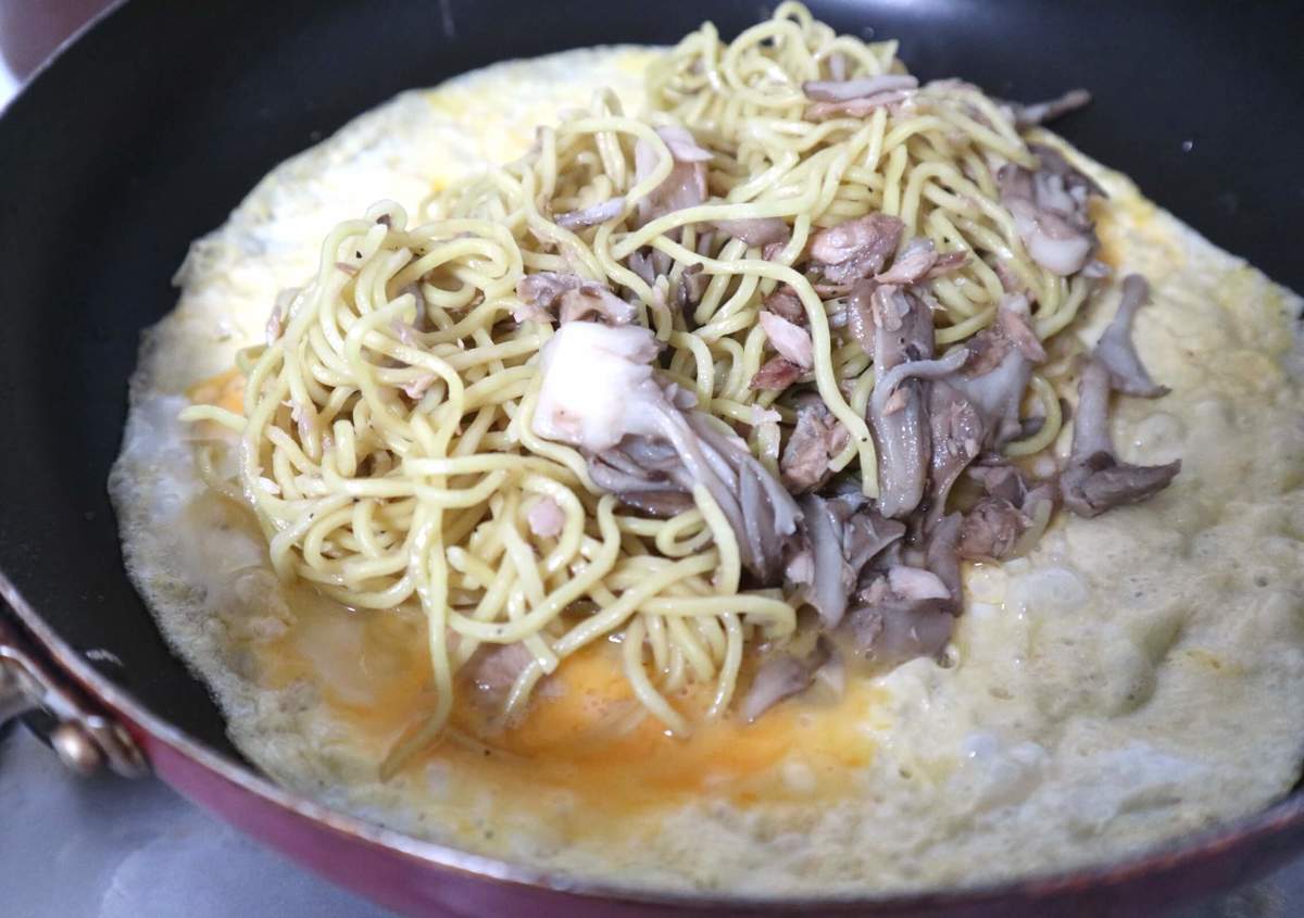 卵で包んでオムそばに!