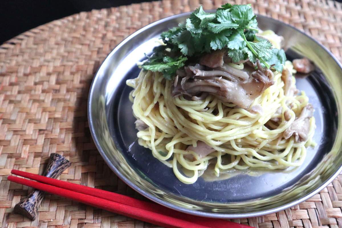 レシピは2食分ですが、1食分の場合はキノコとツナ缶は半量で作ってください。器に盛ったらお好みでパクチーや大葉、小ネギをトッピングします。