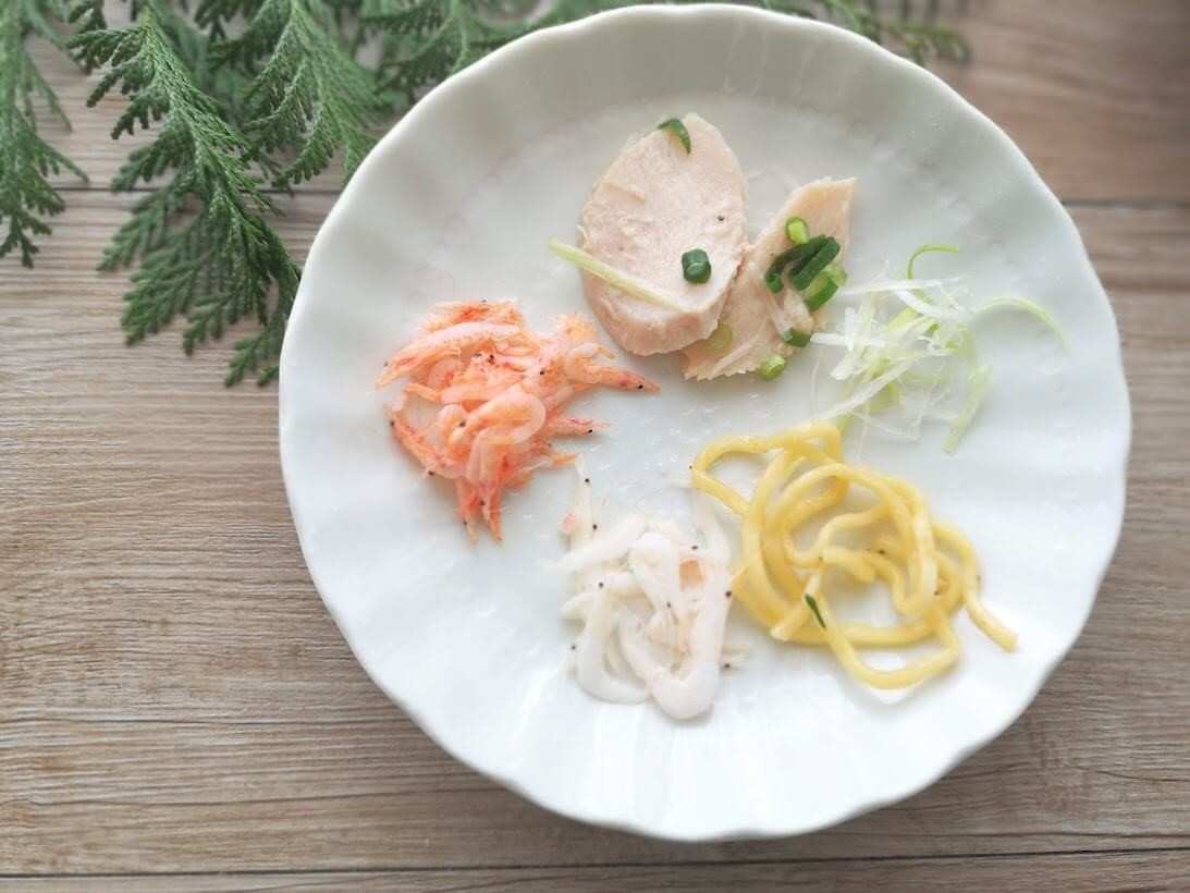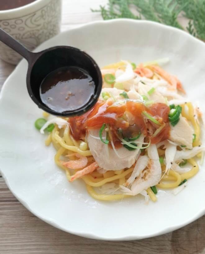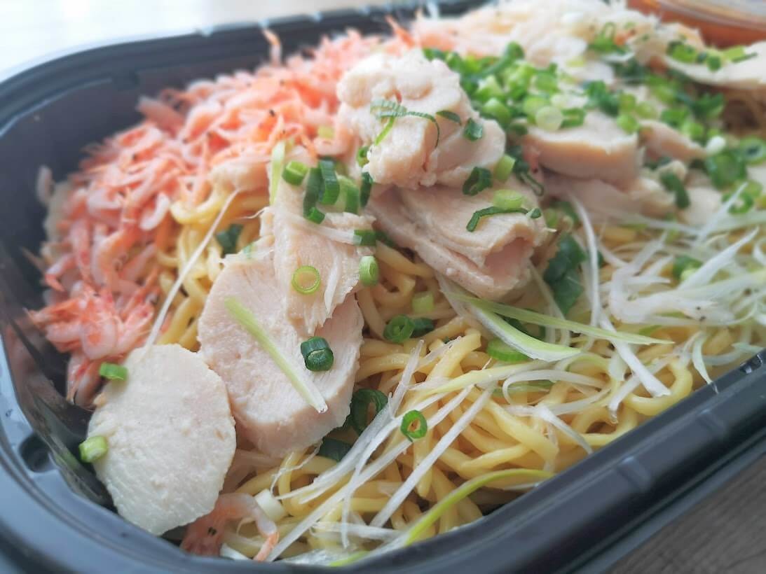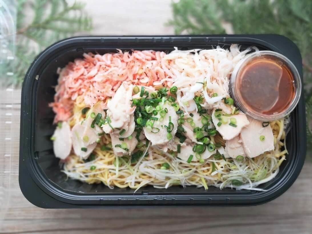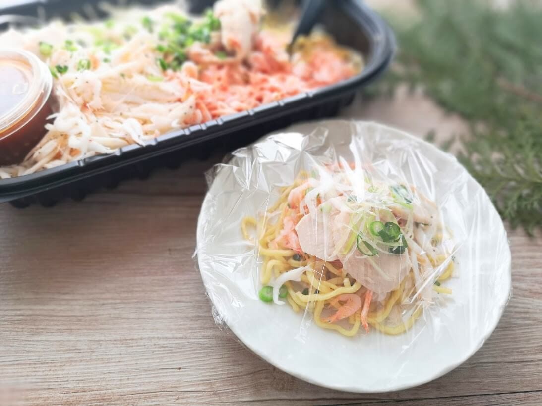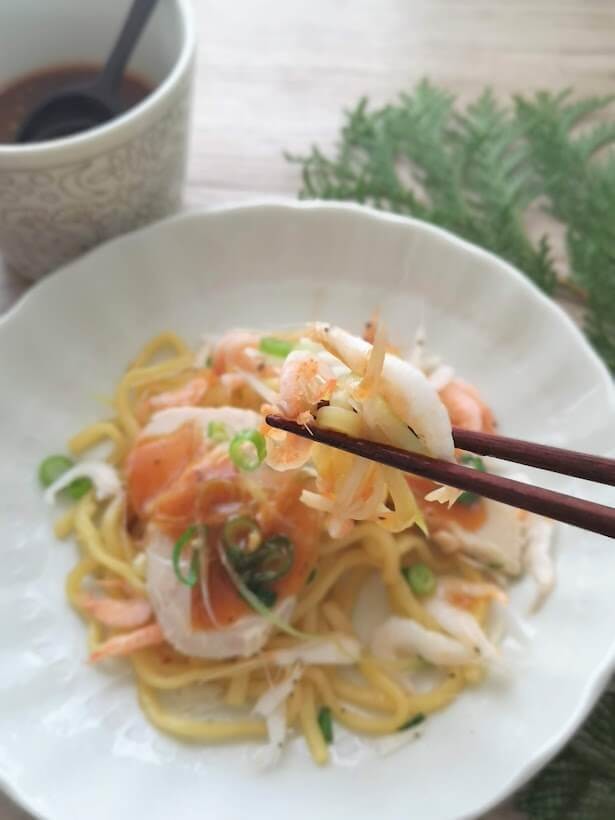 お好みで蒸しえびや、イカなどをトッピングしても美味しくいただけますし、フライパンで炒めながら温めると焼きそば風にいただくこともできるのでおすすめです。