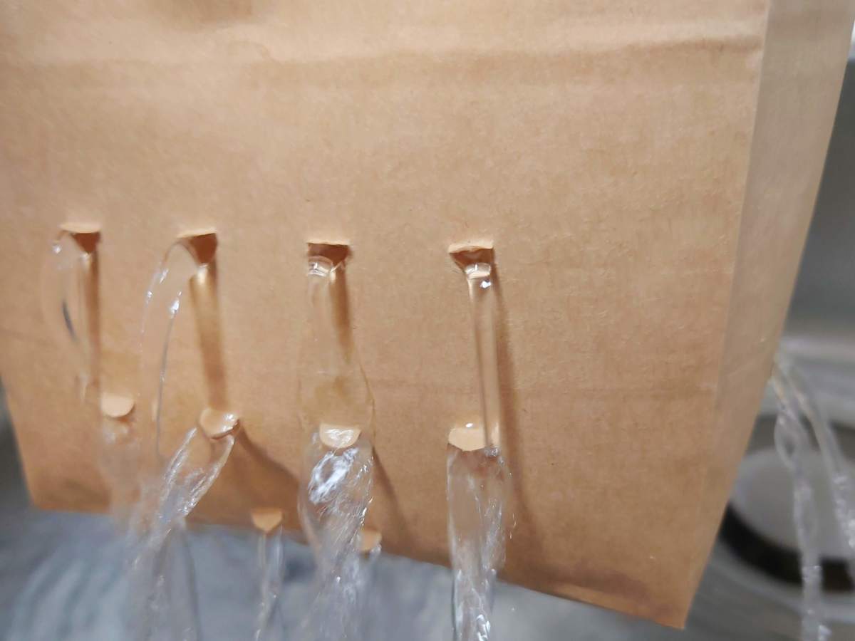 試しに袋に大量に水を流しこんでみました。いきなり破れたりはすることはなく、排水もきちんとできました。