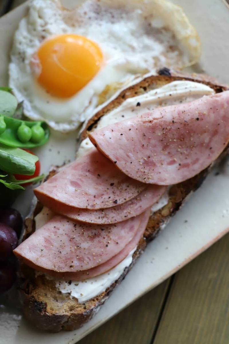 トーストしたドライフルーツやナッツが入ったパンにクリームチーズを塗り、その上にシャウスライスをのせブラックペッパーを挽いています。