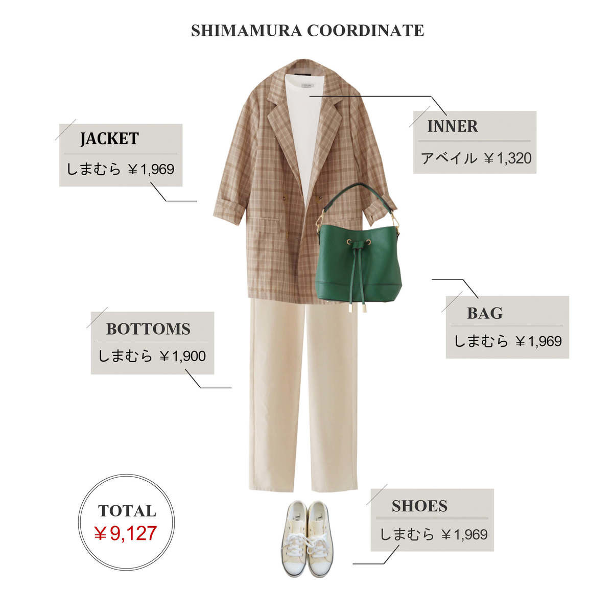 コーデに使用したアイテムはすべて「しまむら」と系列店「アベイル」のものです。