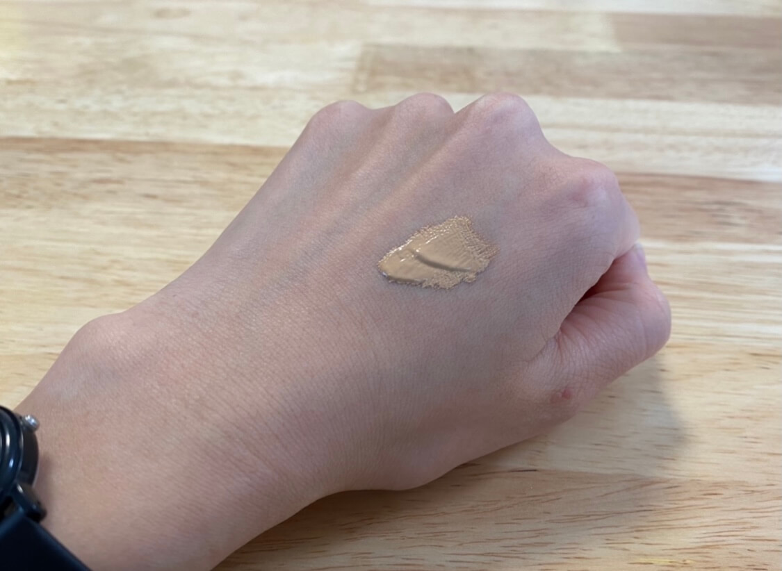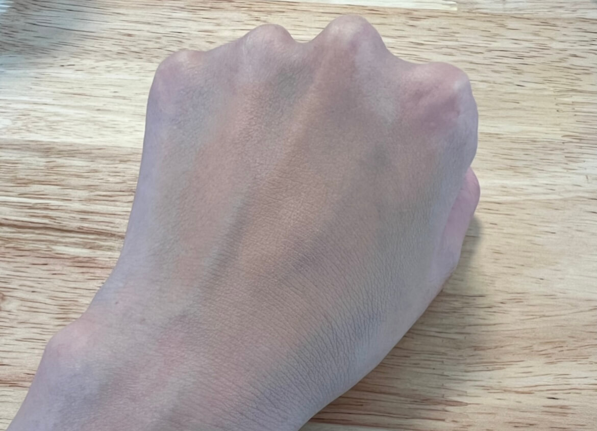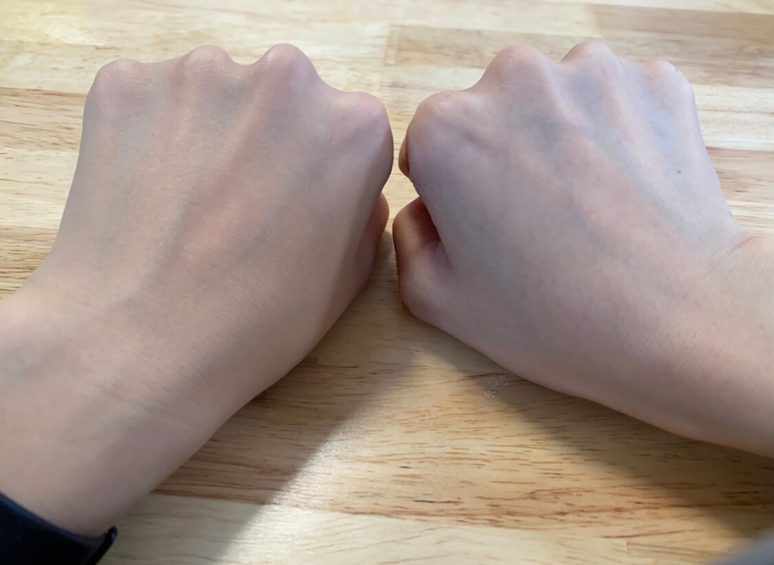 何も塗っていない右側の手と比べて、ファンデーションを塗った左側の手は色味が均一になったのが分かりますか?