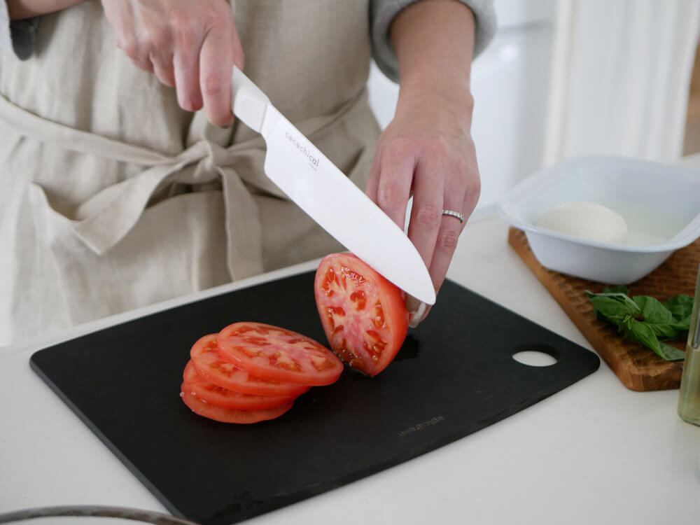 ファインセラミックスからは金属イオンが出ないので、リンゴやレタスを切っても切り口が茶色っぽく変色しにくく、食材に金属の嫌なにおいがつかないので、食材の風味を壊さず料理をおいしく仕上げることができます。肉の脂やニンニクの強いにおいも、刃に残さず洗い流すことができます。