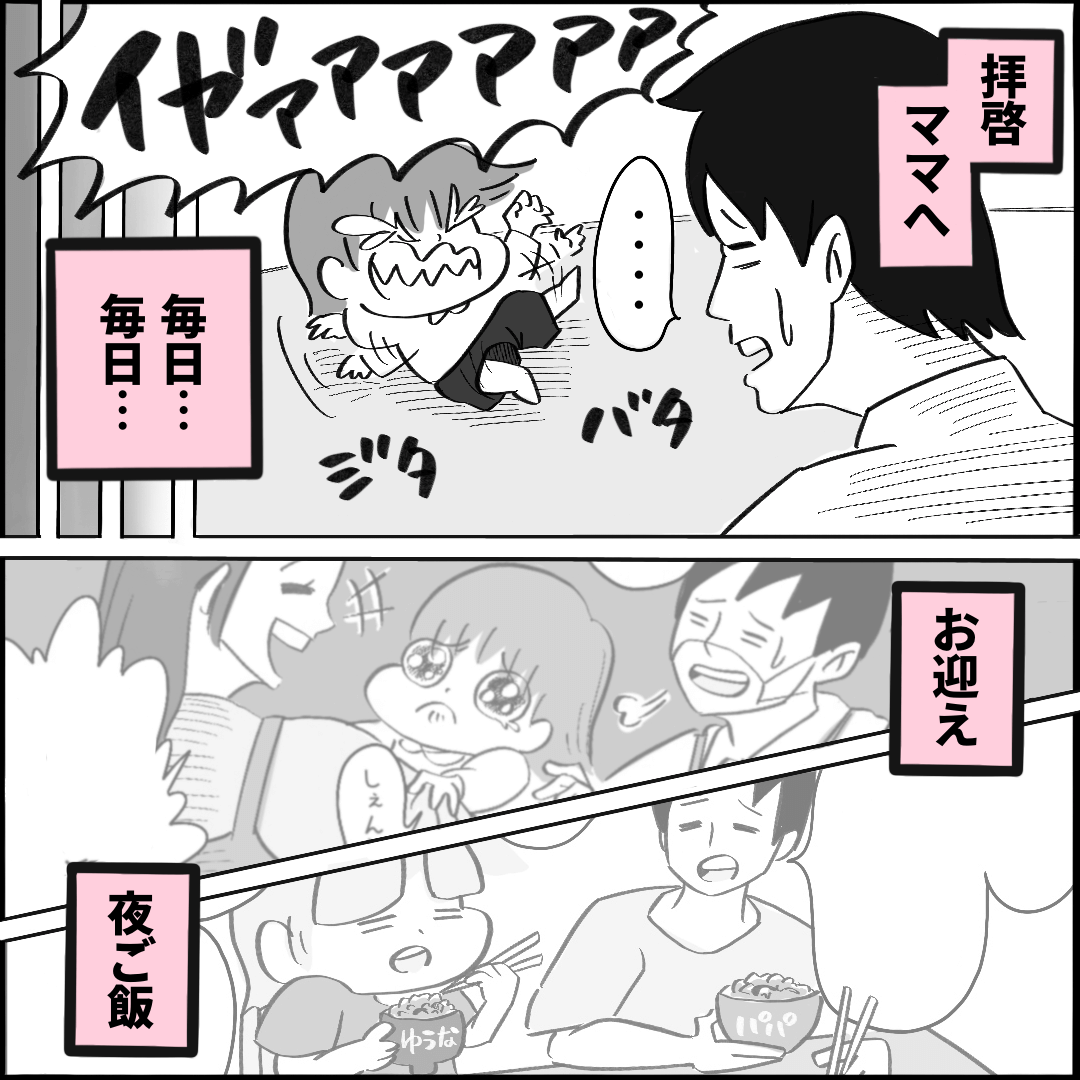 「こばままほんとに毎日ありがとう。一日ワンオペしただけでその大変さマジでわかります……。それなのに昔、“育児は仕事じゃない”なんて言っちゃってごめんなさい。とりあえずタイムマシンで5年前にもどって、あの頃の自分ゴリゴリに成敗しとくね♡」(こばぱぱさん)