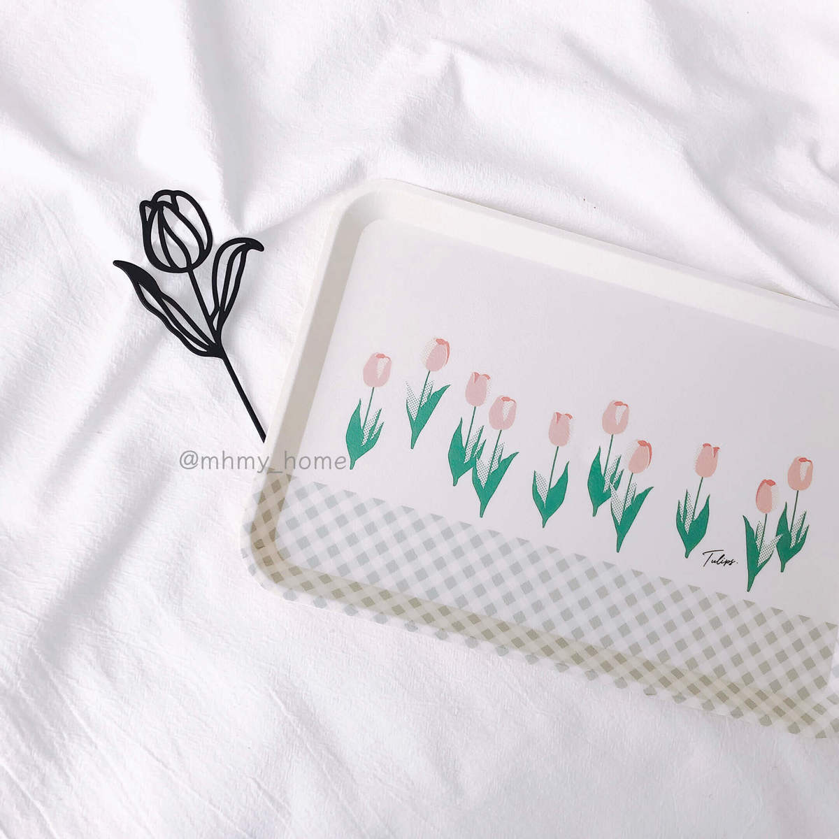 チューリップ×チェック柄のトレイもキャンドゥのアイテムです。