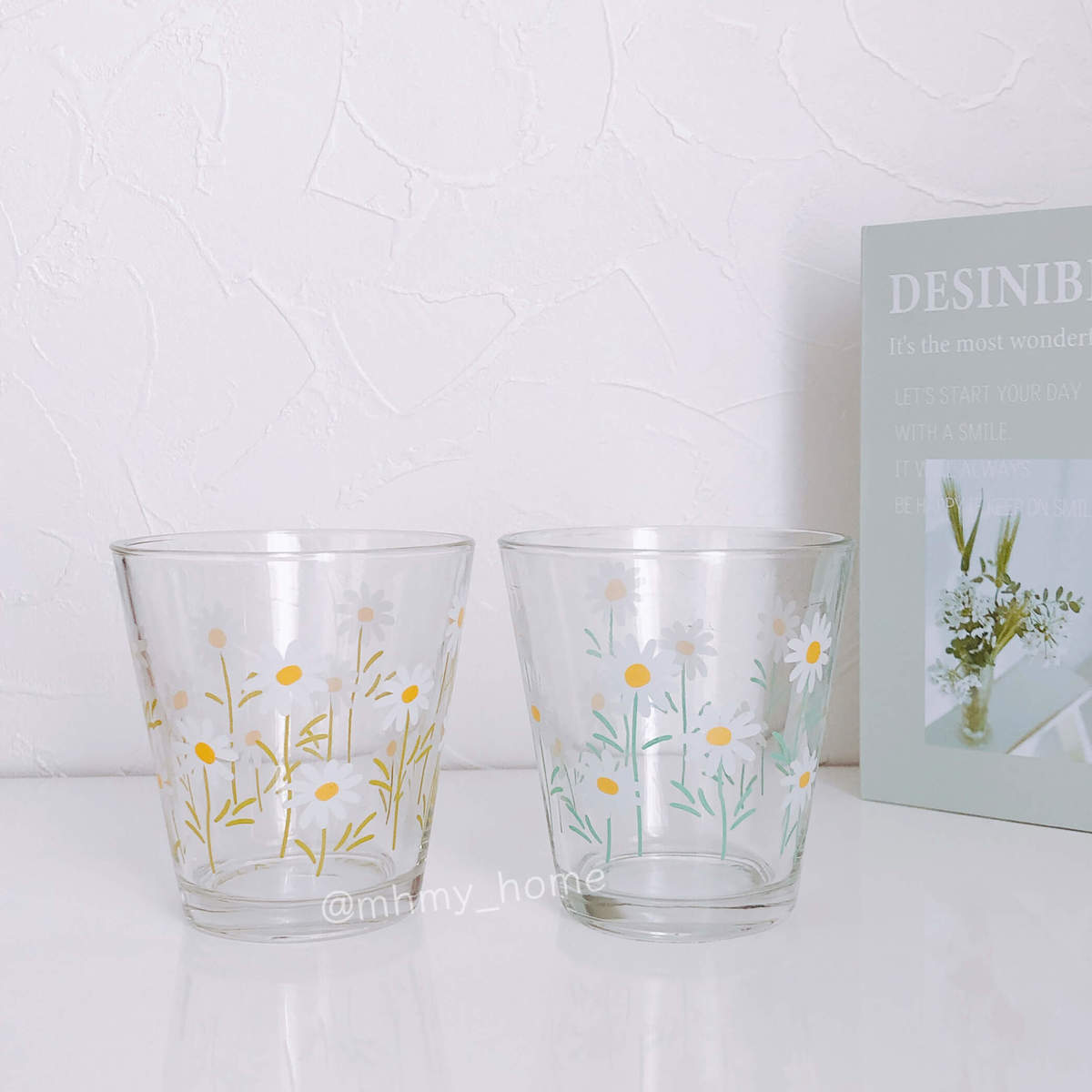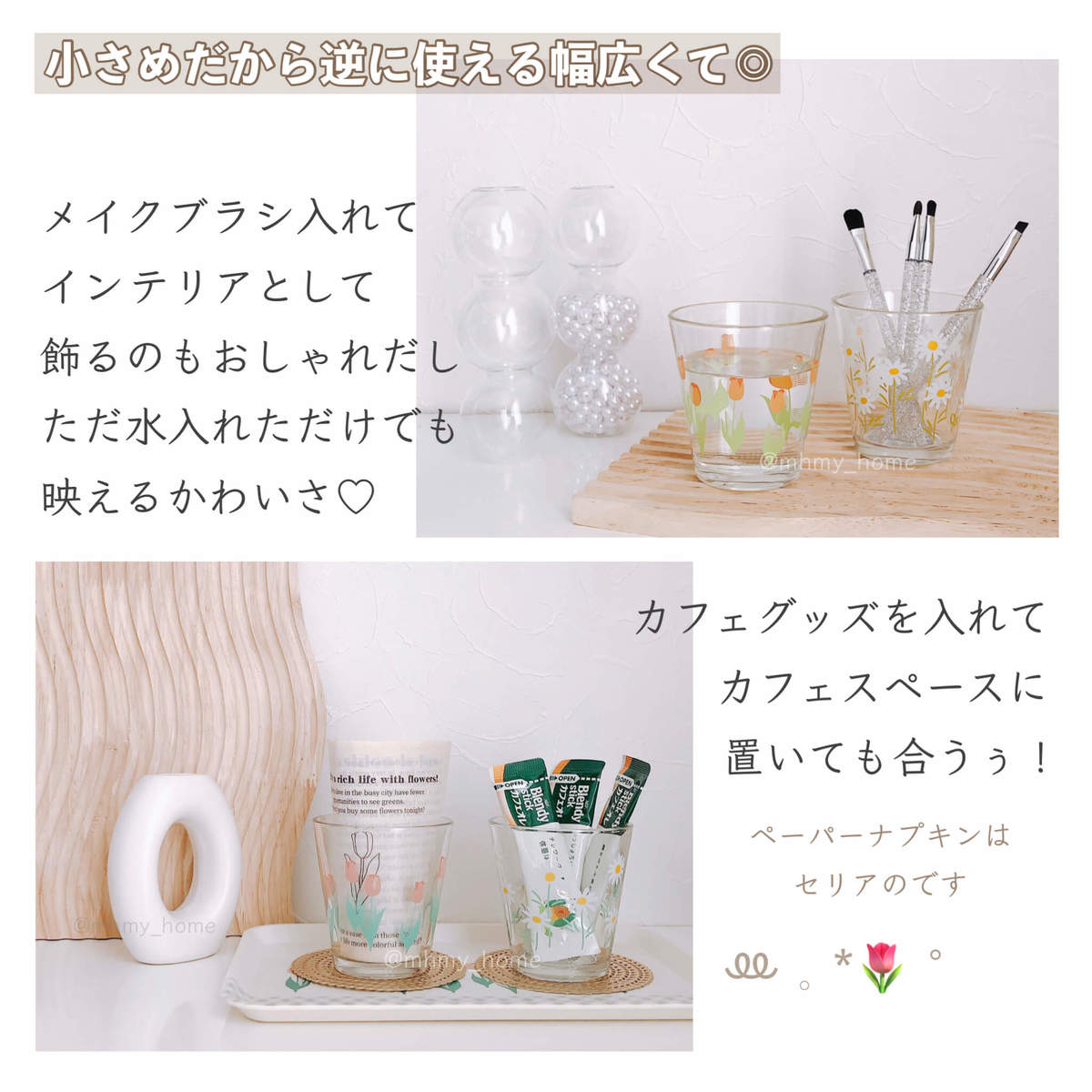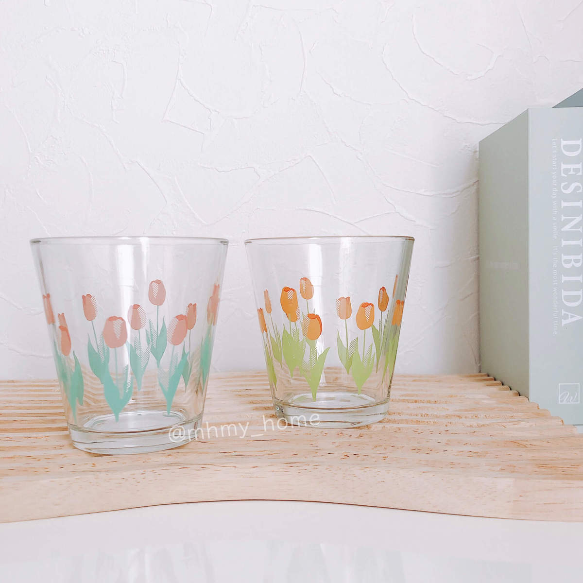 韓国風インテリアでよく見かけるグラスが、キャンドゥで買えちゃうから驚き!チューリップ柄はこの2種類で、レトロっぽいデザインがとっても可愛くないですか♪