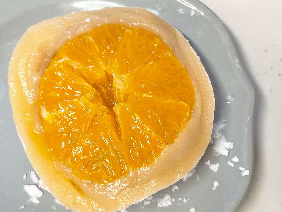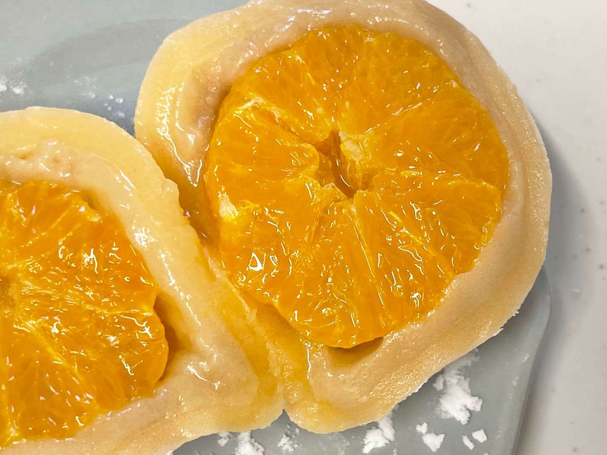 まるごと1個の蜜柑を白あんとやわらかいおもちで包んだ大福です。