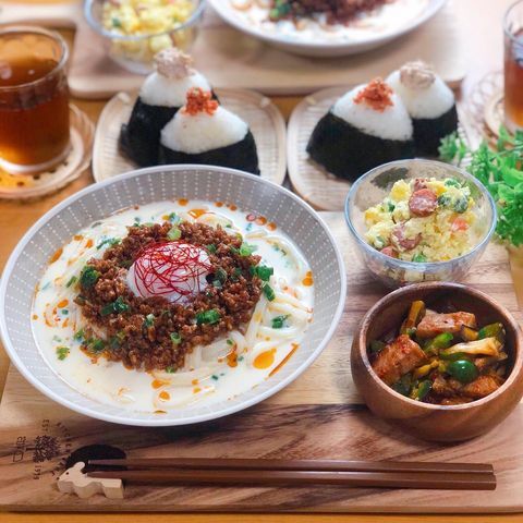 見た目も華やかな、ジャージャー麺風レシピ。肉味噌はレンチンで調理可能&作り置きもできるので、事前にストックしておくと便利。仕上げに温玉&白髪ネギをトッピングして召し上がれ。(調理時間:10分)