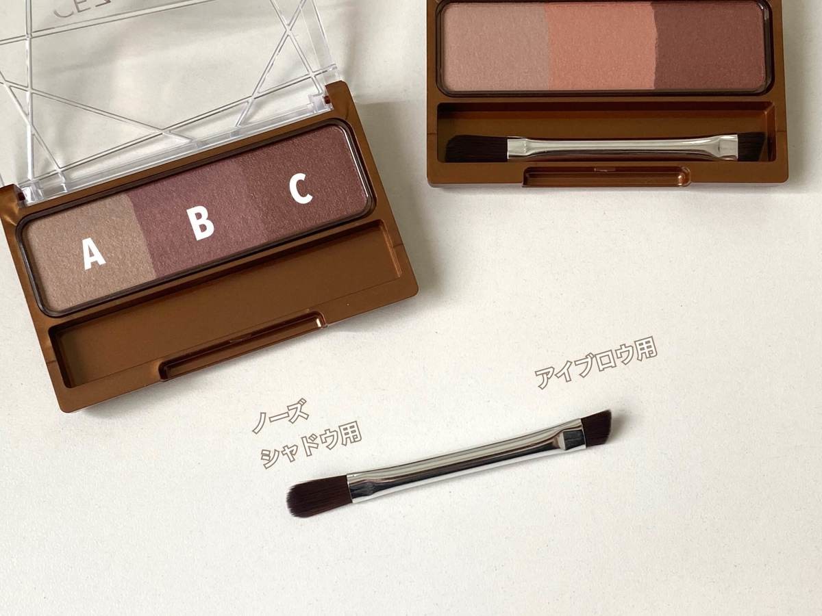 セザンヌの「ノーズ&アイブロウパウダー」は、ノーズシャドウ入りのアイブロウパウダー。左の明るいカラーをノーズシャドウとして使用できます。これ一つで立体感のある目元になると人気のアイテムなんです。
