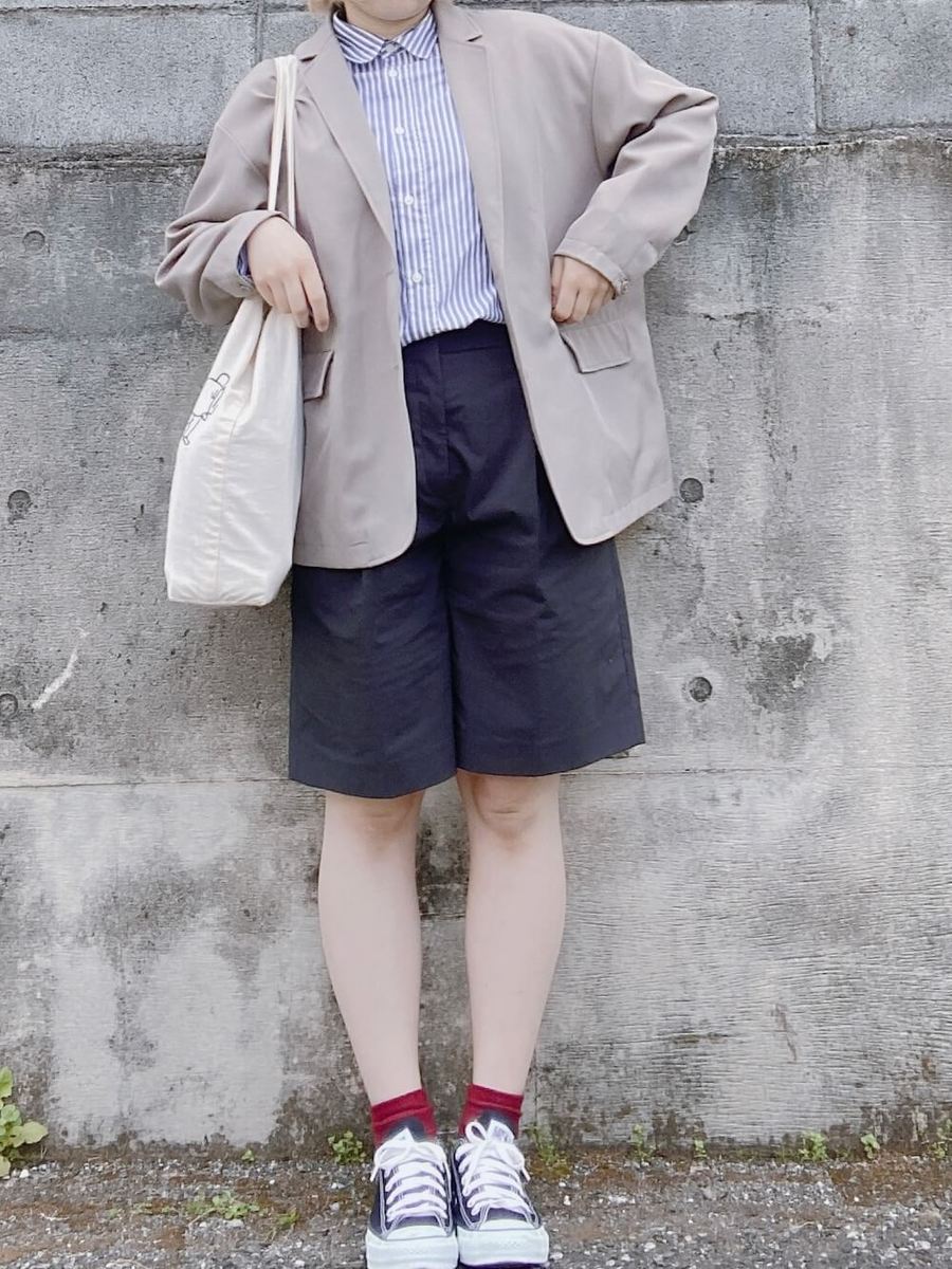 ショートパンツにジャケット合わせでかっちりと。ストライプシャツをタックインしてお行儀のいいジャケットスタイルに仕上げます。